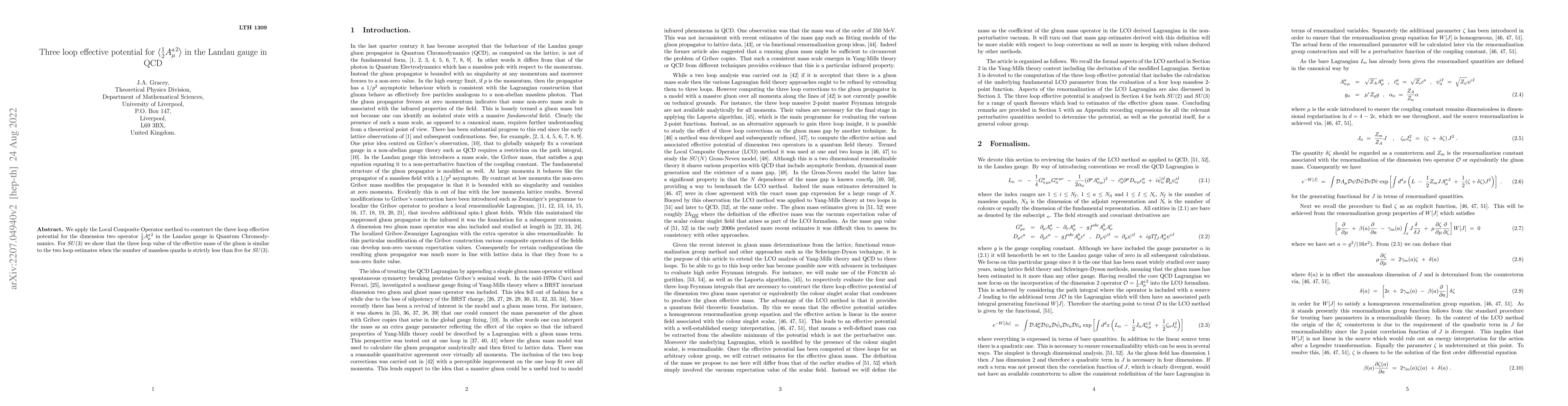 We apply the Local Composite Operator method to construct the three loop effective potential for the dimension two operator $\frac{1}{2} { A_\mu^a }^2$ in the Landau gauge in Quantum Chromodynamics. For $SU(3)$ we show that the three loop value of the effective mass of the gluon is similar to the two loop estimates when the number of massless quarks is strictly less than five for $SU(3)$.