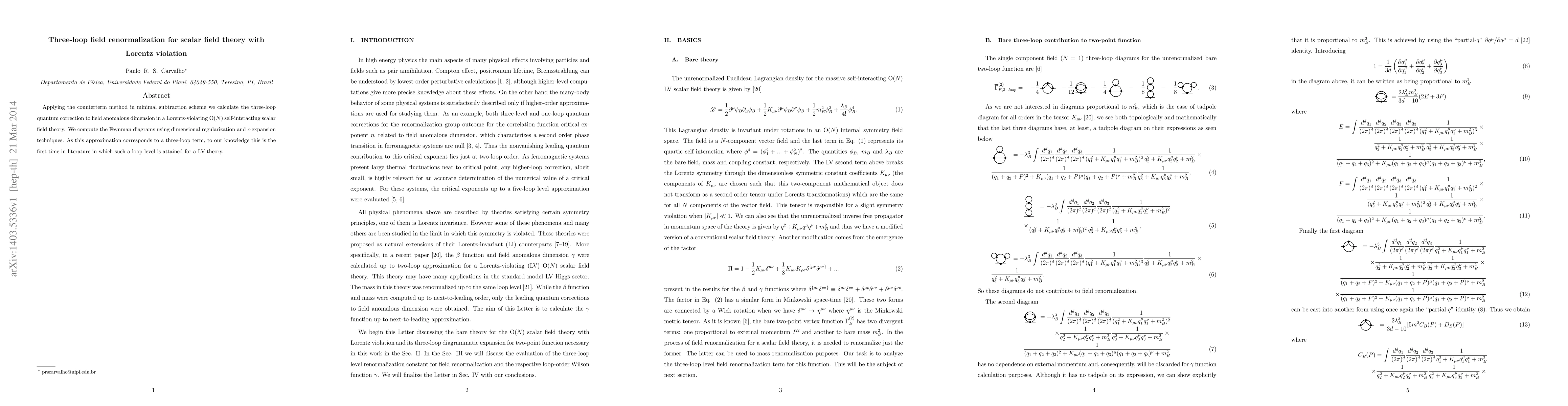 This paper calculates the three-loop quantum correction to the field anomalous dimension in a Lorentz-violating scalar field theory using dimensional regularization and epsilon-expansion techniques, marking the first time such a loop level is achieved for an LV theory.