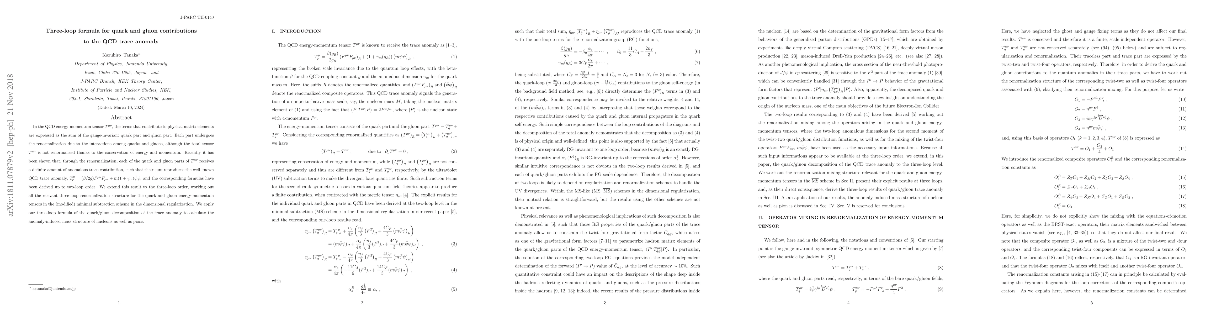 This paper extends the calculation of QCD trace anomaly contributions from quarks and gluons to the three-loop order, providing a comprehensive formula for their renormalization structure. The derived three-loop formula is applied to determine the anomaly-induced mass structure of nucleons and pions.