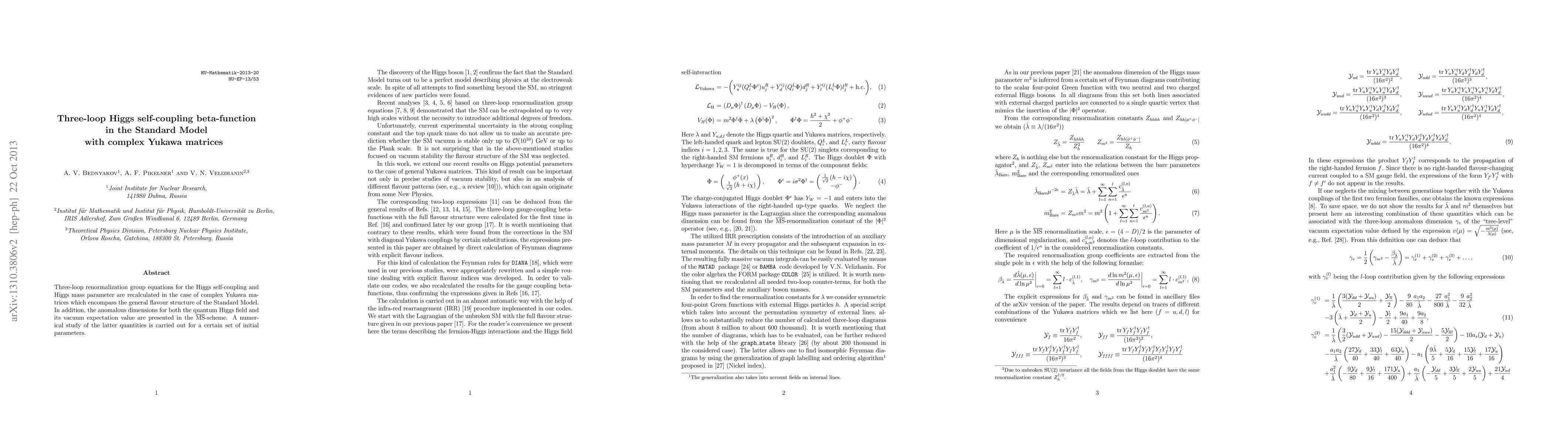 This paper recalculates the three-loop renormalization group equations for the Higgs self-coupling and mass parameter in the Standard Model with complex Yukawa matrices, presenting anomalous dimensions in the $\overline{MS}$-scheme and conducting a numerical study for specific initial parameters.