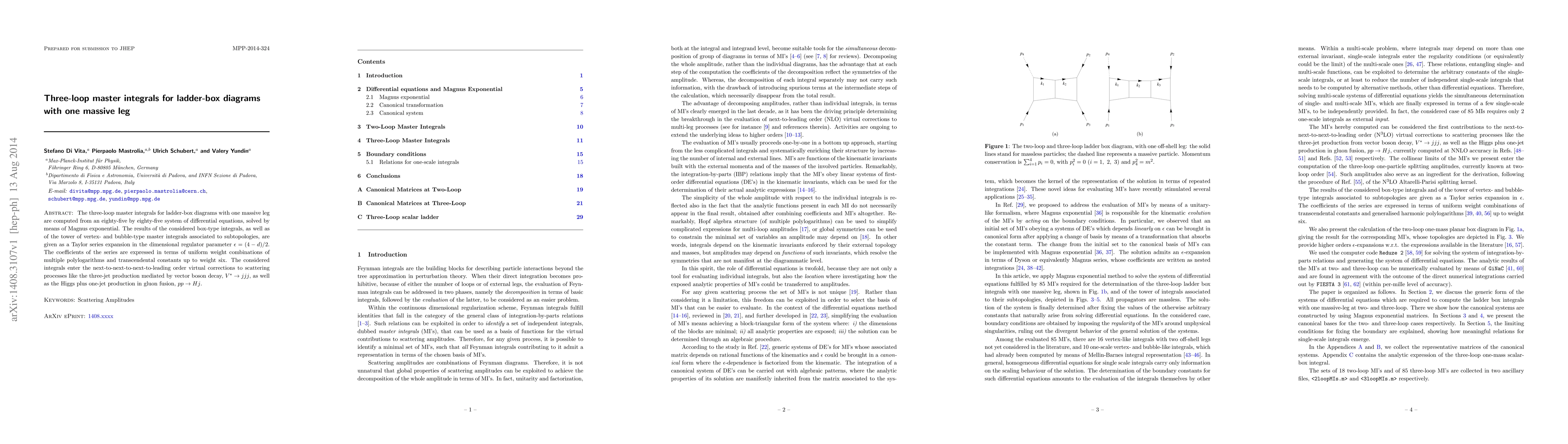 This paper computes three-loop master integrals for ladder-box diagrams with one massive leg, solving an eighty-five by eighty-five system of differential equations via the Magnus exponential. The results are presented as Taylor series in the dimensional regulator parameter, expressed in terms of multiple polylogarithms and transcendental constants, relevant for next-to-next-to-next-to-leading order corrections in scattering processes.