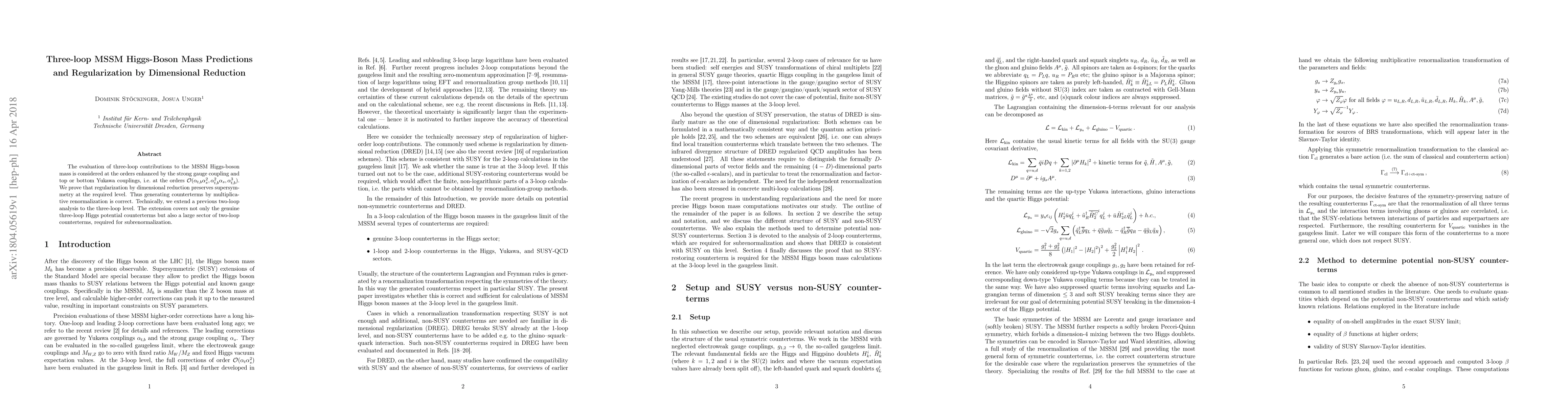 This paper evaluates three-loop contributions to the MSSM Higgs-boson mass, focusing on terms enhanced by strong gauge and Yukawa couplings. It demonstrates that regularization via dimensional reduction maintains supersymmetry, ensuring the correctness of multiplicative renormalization.