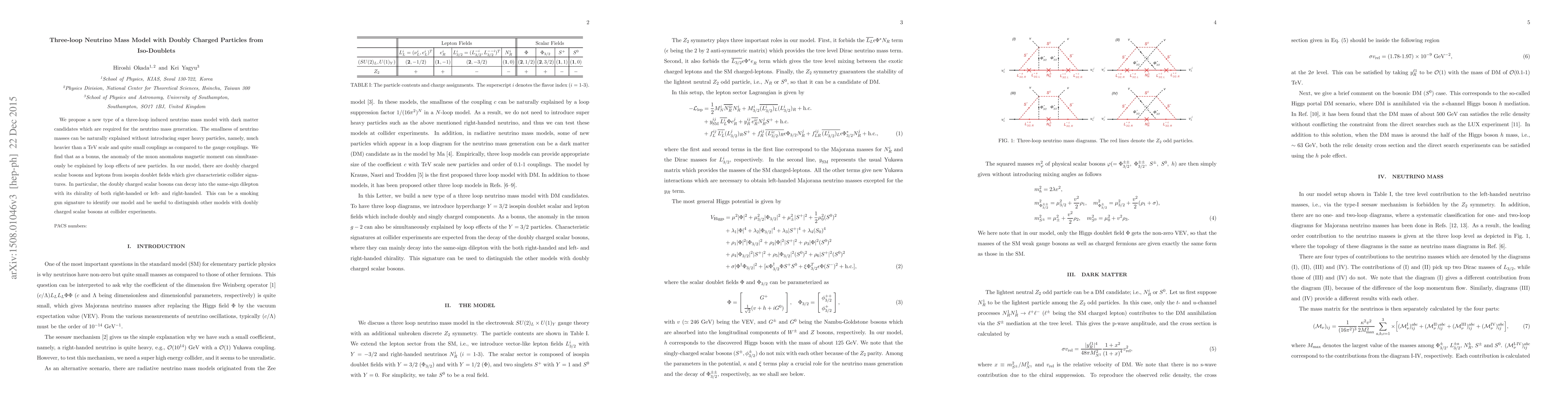 This paper proposes a three-loop neutrino mass model featuring doubly charged particles from iso-doublets, explaining the smallness of neutrino masses without super heavy particles. The model also addresses the muon anomalous magnetic moment anomaly and predicts unique collider signatures, particularly from the decay of doubly charged scalar bosons into same-sign dileptons.
