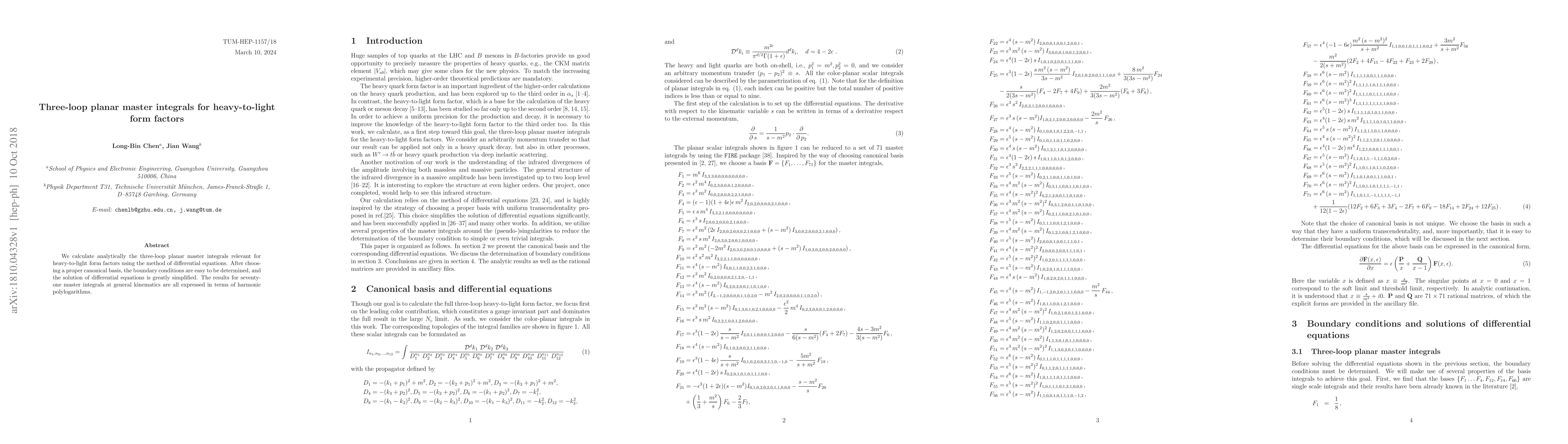 This paper analytically computes seventy-one three-loop planar master integrals for heavy-to-light form factors using differential equations. The chosen canonical basis simplifies the solution process, and results are expressed in terms of harmonic polylogarithms.