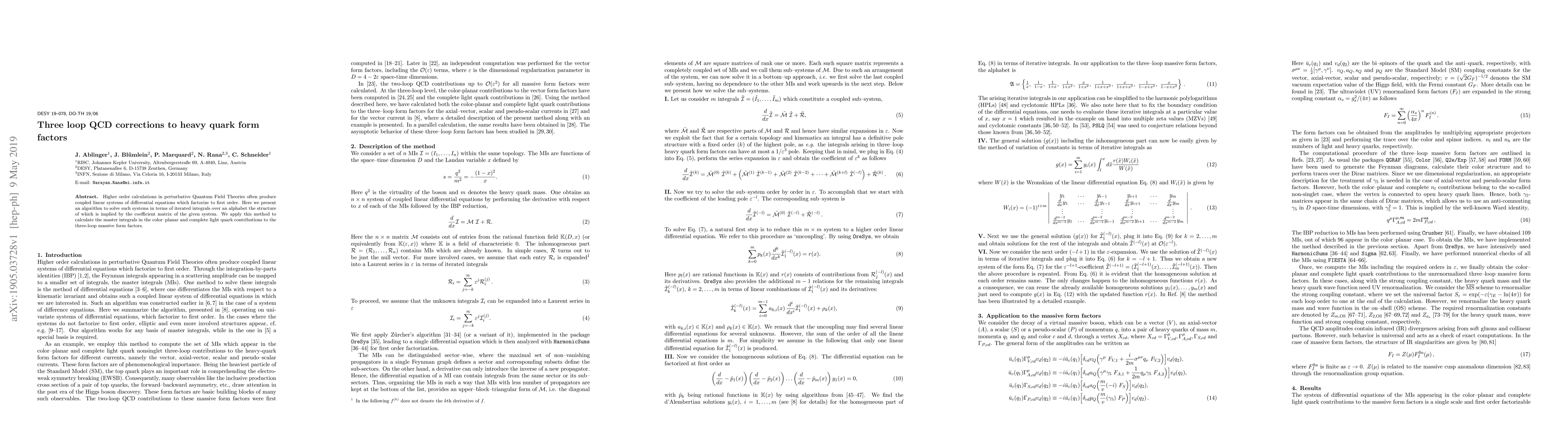 This paper presents an algorithm to solve coupled linear systems of differential equations arising in higher-order QCD corrections, applying it to compute three-loop massive form factors for heavy quarks and light quarks. The method involves iterated integrals over an implied alphabet structure derived from the coefficient matrix.