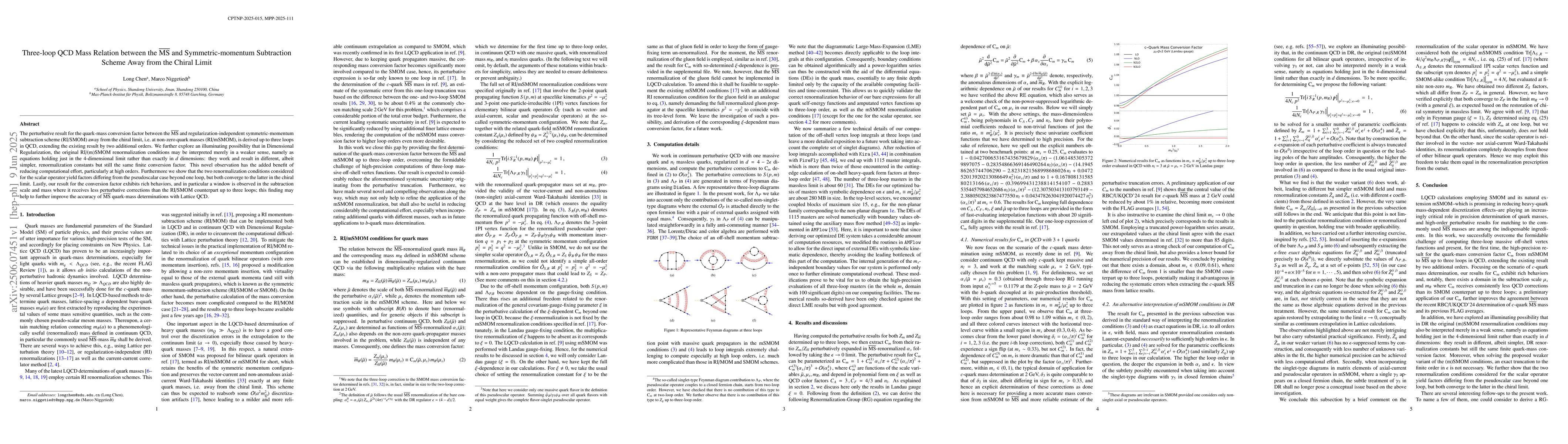The perturbative result for the quark-mass conversion factor between the $\overline{\mathrm{MS}}$ and regularization-independent symmetric-momentum subtraction scheme (RI/SMOM) away from the chiral limit, i.e. at non-zero quark masses (RI/mSMOM), is derived up to three loops in QCD, extending the existing result by two additional orders. We further explore an illuminating possibility that in Dimensional Regularization, the original RI/(m)SMOM renormalization conditions may be interpreted merely in a weaker sense, namely as equations holding just in the 4-dimensional limit rather than exactly in $d$ dimensions: they work and result in different, albeit simpler, renormalization constants but still the same finite conversion factor. This novel observation has the added benefit of reducing computational effort, particularly at high orders. Furthermore we show that the two renormalization conditions considered for the scalar operator yield factors differing from the pseudoscalar case beyond one loop, but both converge to the latter in the chiral limit. Lastly, our result for the conversion factor exhibits rich behaviors, and in particular a window is observed in the subtraction scale and mass where it receives less perturbative corrections than the RI/SMOM counterpart up to three loops; this finding may help to further improve the accuracy of $\overline{\mathrm{MS}}$ quark-mass determinations with Lattice QCD.