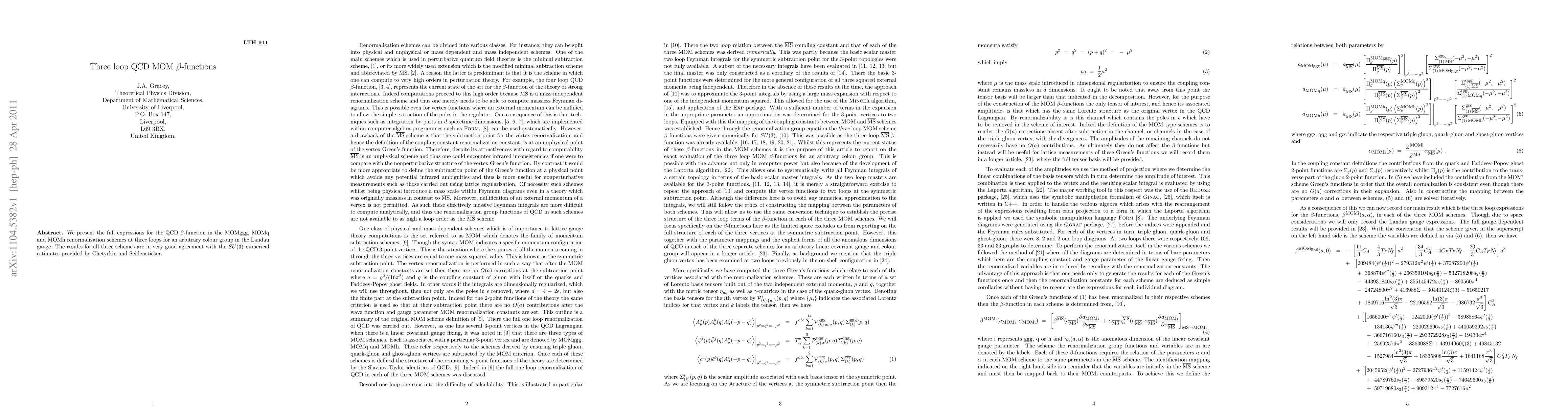 This paper provides the complete three-loop QCD beta-function expressions in three different MOM renormalization schemes: MOMggg, MOMq, and MOMh, for any color group in the Landau gauge. The results align well with SU(3) numerical estimates from previous studies.