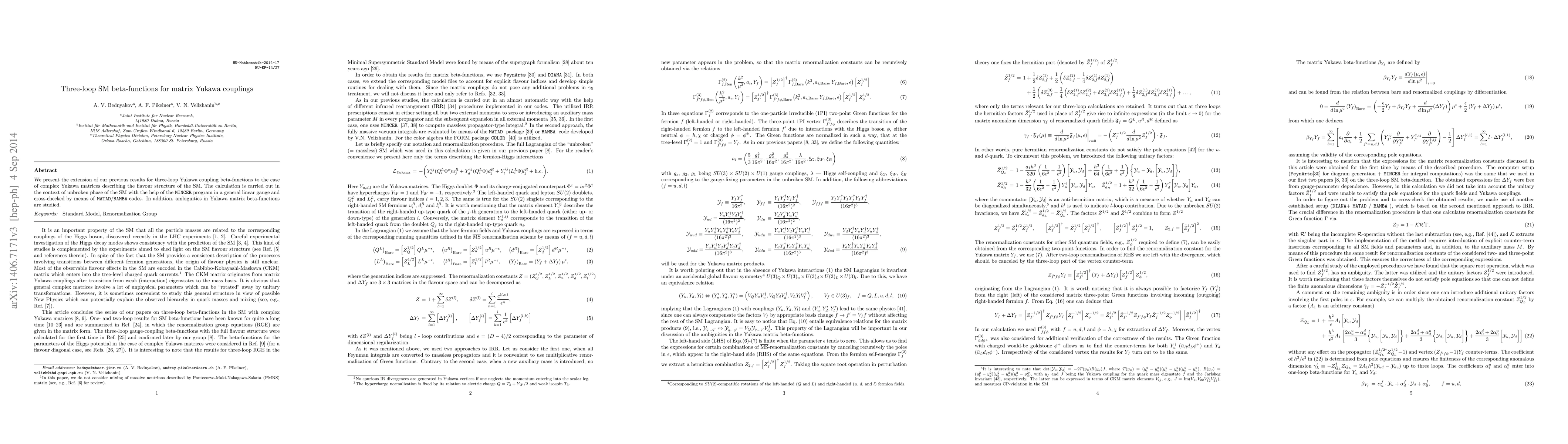 This paper extends three-loop beta-function calculations for complex Yukawa matrices in the Standard Model, employing MINCER, MATAD/BAMBA codes, and examines ambiguities in the resulting Yukawa matrix beta-functions within the unbroken SM phase.