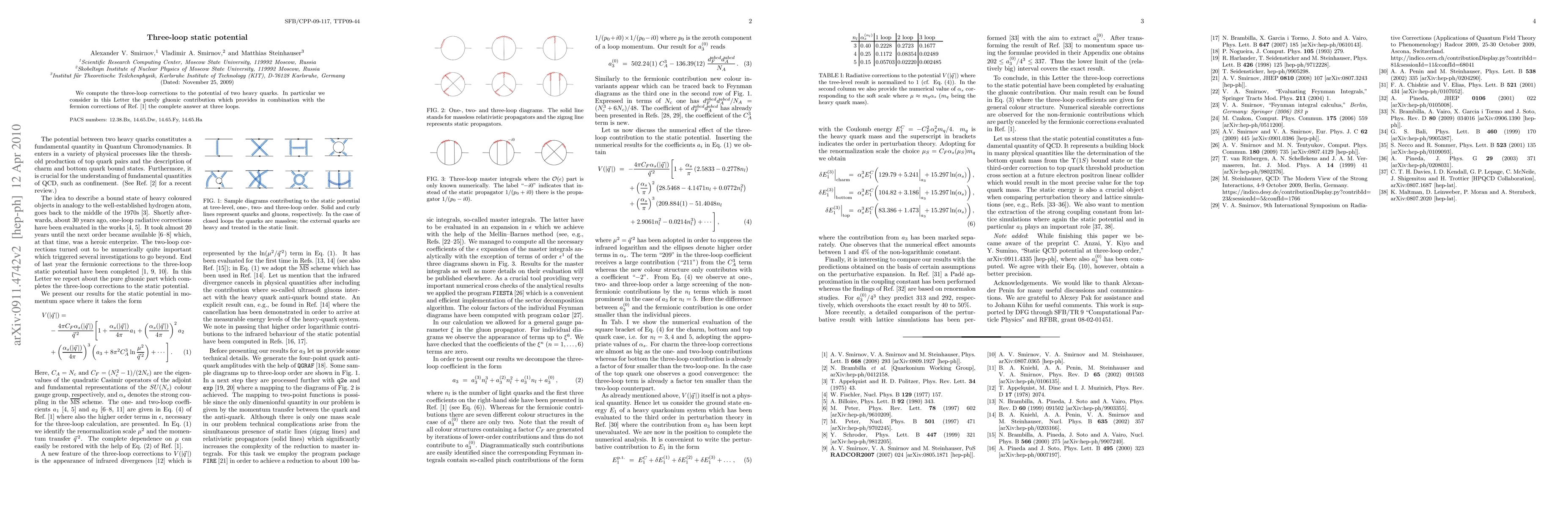 We compute the three-loop corrections to the potential of two heavy quarks. In particular we consider in this Letter the purely gluonic contribution which provides in combination with the fermion corrections of Ref. \cite{Smirnov:2008pn} the complete answer at three loops.