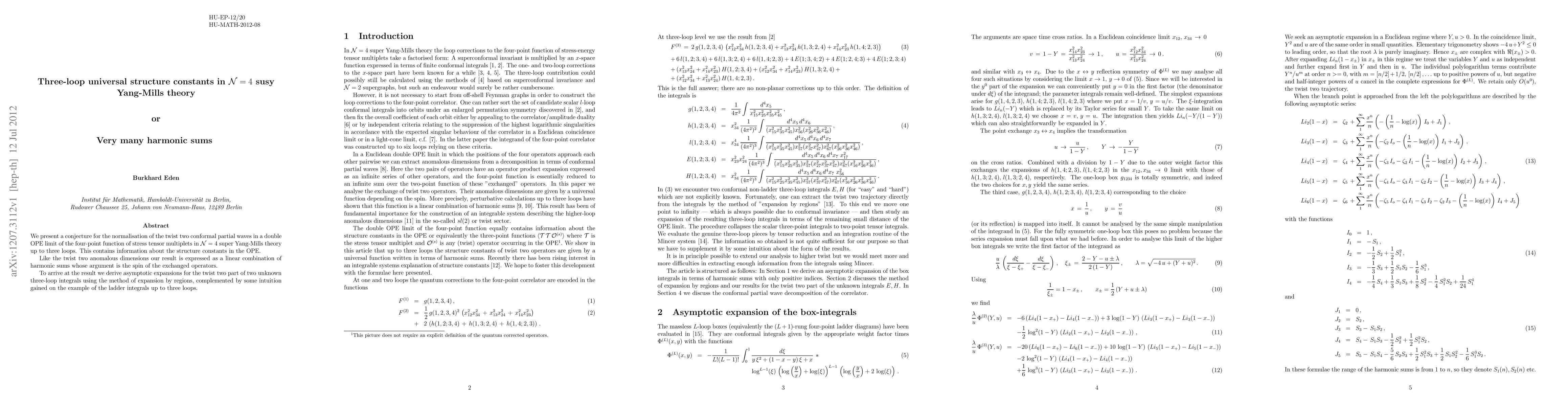 We present a conjecture for the normalisation of the twist two conformal partial waves in a double OPE limit of the four-point function of stress tensor multiplets in N = 4 super Yang-Mills theory up to three loops. This contains information about the structure constants in the OPE. Like the twist two anomalous dimensions our result is expressed as a linear combination of harmonic sums whose argument is the spin of the exchanged operators. To arrive at the result we derive asymptotic expansions for the twist two part of two unknown three-loop integrals using the method of expansion by regions, complemented by some intuition gained on the example of the ladder integrals up to three loops.