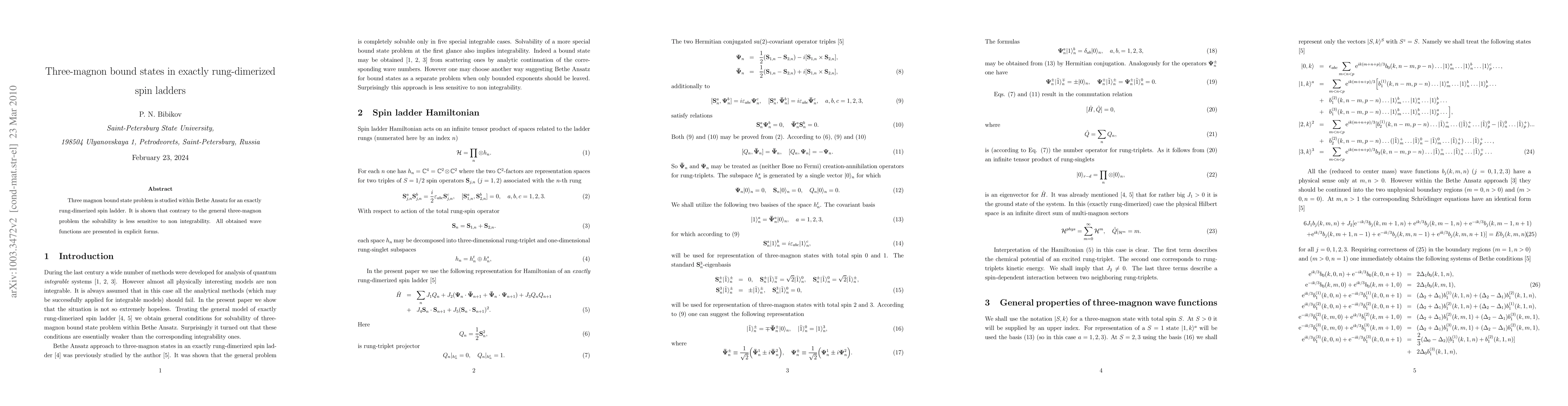 Summary: The paper uses the Bethe Ansatz to identify three-magnon bound states in exactly rung-dimerized spin ladders and proposes a conjectured dispersion law for higher magnon bound states. It also suggests that the gas parameter may exhibit either smooth or abrupt changes depending on the coupling constants at the phase boundary.