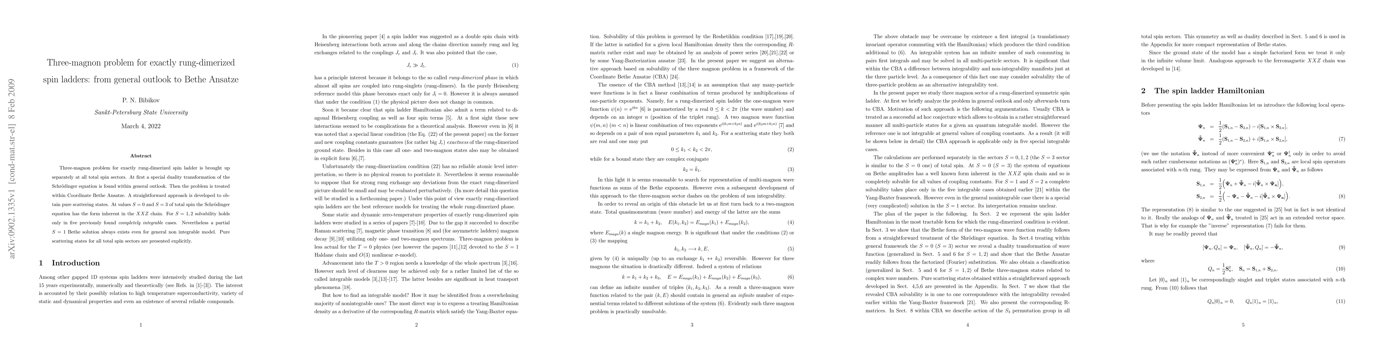 Three-magnon problem for exactly rung-dimerized spin ladder is brought up separately at all total spin sectors. At first a special duality transformation of the $\rm Schr\ddot odinger$ equation is found within general outlook. Then the problem is treated within Coordinate Bethe Ansatze. A straightforward approach is developed to obtain pure scattering states. At values S=0 and S=3 of total spin the $\rm Schr\ddot odinger$ equation has the form inherent in the $XXZ$ chain. For $S=1,2$ solvability holds only in five previously found {\it completely integrable} cases. Nevertheless a partial S=1 Bethe solution always exists even for general non integrable model. Pure scattering states for all total spin sectors are presented explicitly.