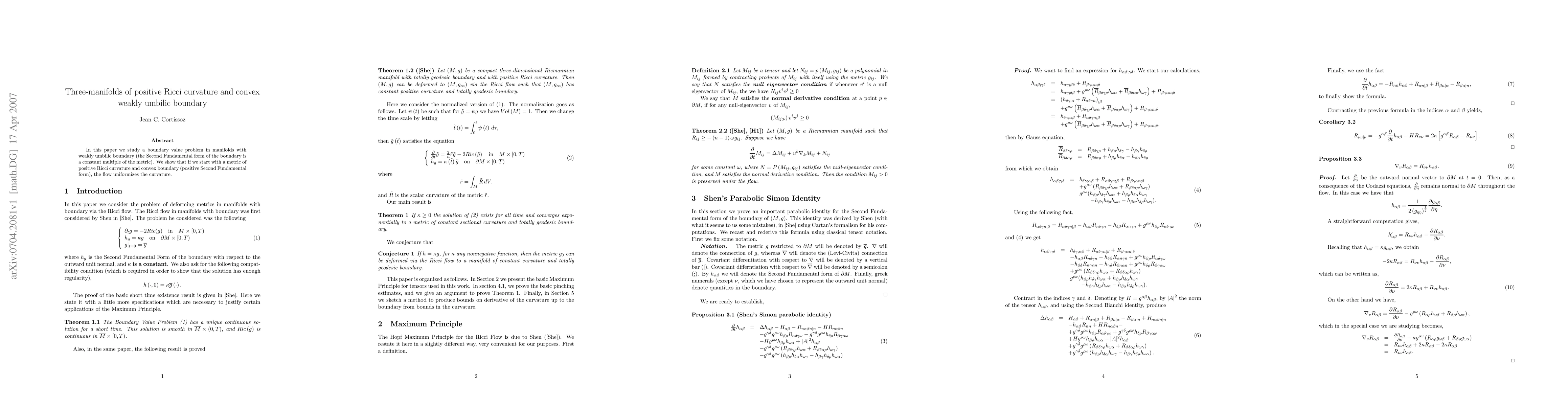 In this paper we consider three-manifolds with weakly umbilic boundary (the Second Fundamental form of the boundary is a constant multiple of the metric). We show that if the initial manifold has positive Ricci curvature and the boundary is convex (nonnegative Second Fundamental form), its metric can be deformed via the Ricci flow to a metric of constant curvature and totally geodesic boundary.