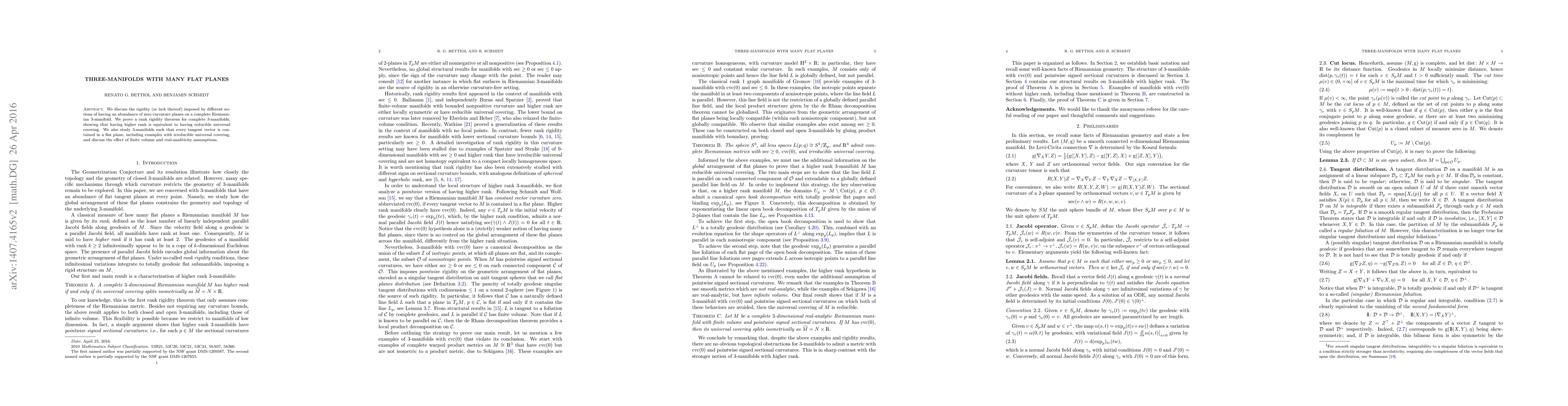 We discuss the rigidity (or lack thereof) imposed by different notions of having an abundance of zero curvature planes on a complete Riemannian 3-manifold. We prove a rank rigidity theorem for complete 3-manifolds, showing that having higher rank is equivalent to having reducible universal covering. We also study 3-manifolds such that every tangent vector is contained in a flat plane, including examples with irreducible universal covering, and discuss the effect of finite volume and real-analiticity assumptions.