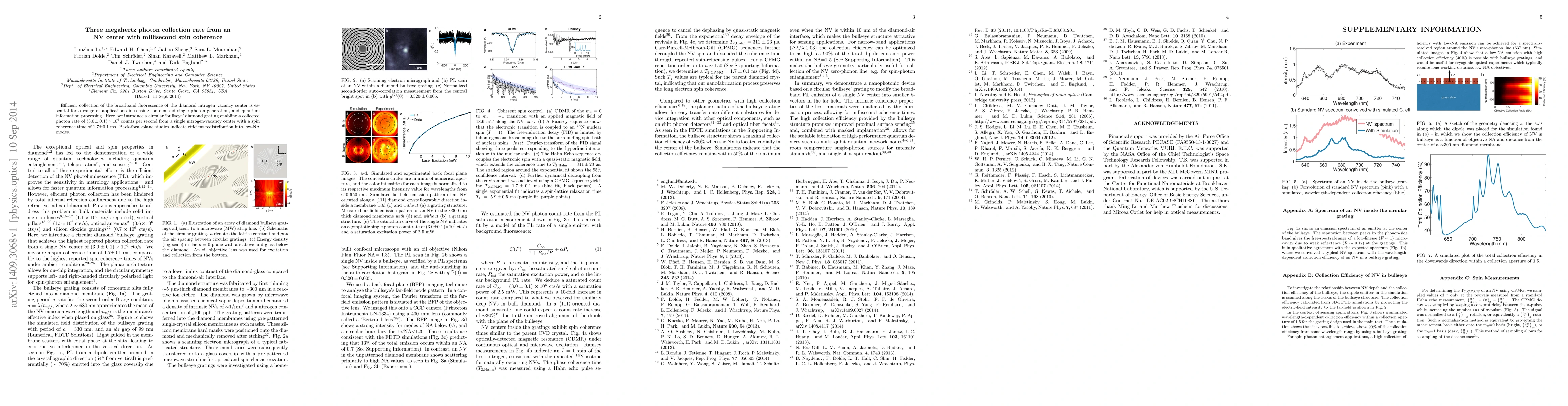 This paper introduces a circular "bullseye" diamond grating that achieves a photon collection rate of $(3.0\pm0.1)\times10^6$ counts per second from a single NV center, crucial for applications in sensing and quantum information processing, alongside a spin coherence time of 1.7$\pm$0.1 ms. The design effectively redistributes photons into low-NA modes.