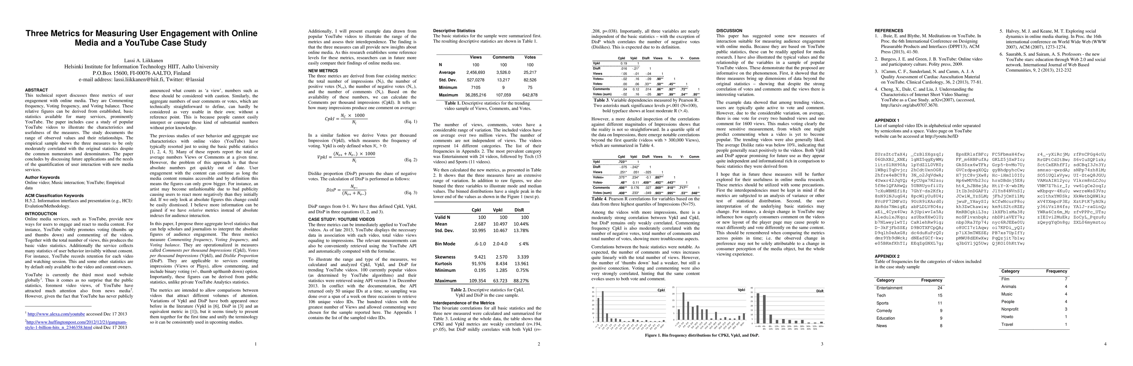 A research paper introduces three metrics for measuring user engagement with online media, including commenting frequency, voting frequency, and voting balance, which were found to only moderately correlate with original statistics on popular YouTube videos.