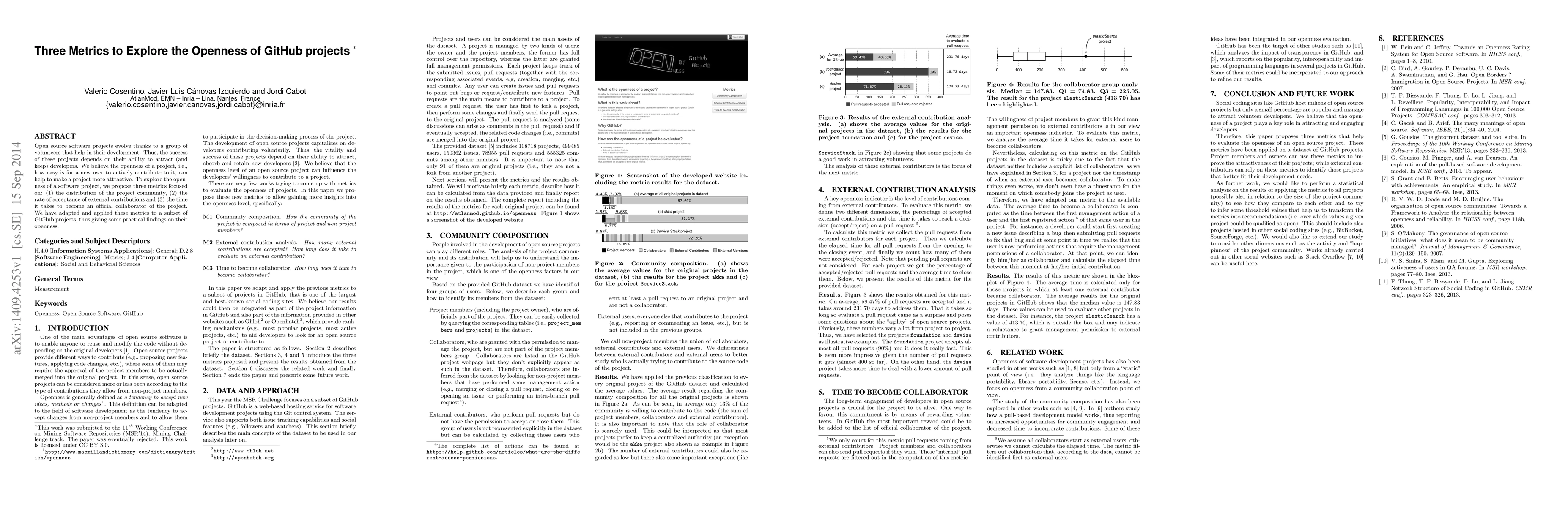 Open source software projects evolve thanks to a group of volunteers that help in their development. Thus, the success of these projects depends on their ability to attract (and keep) developers. We believe the openness of a project, i.e., how easy is for a new user to actively contribute to it, can help to make a project more attractive. To explore the openness of a software project, we propose three metrics focused on: (1) the distribution of the project community, (2) the rate of acceptance of external contributions and (3) the time it takes to become an official collaborator of the project. We have adapted and applied these metrics to a subset of GitHub projects, thus giving some practical findings on their openness.