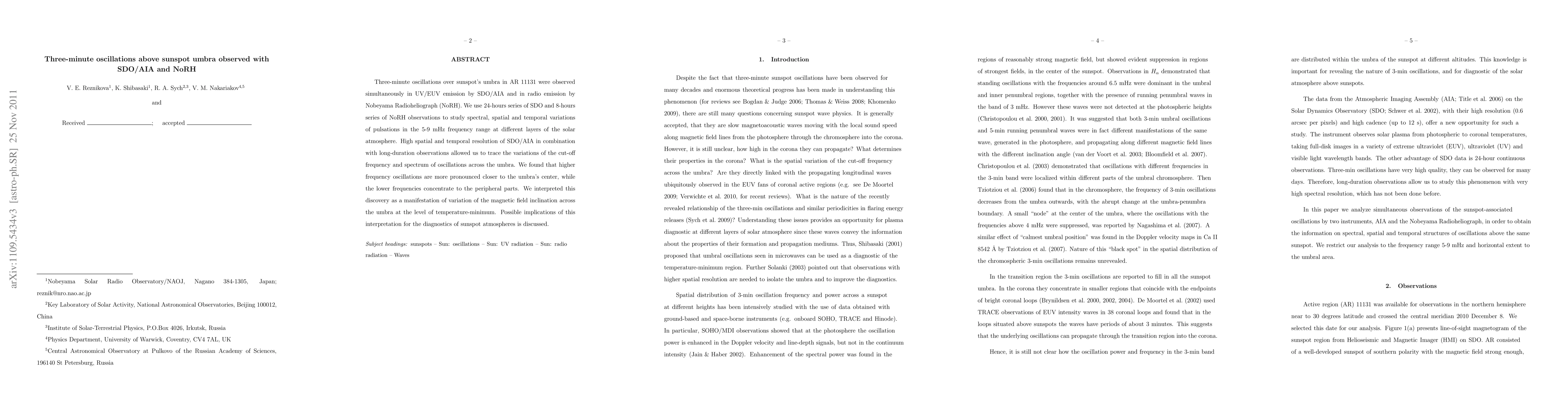 This paper investigates three-minute oscillations above a sunspot umbra using SDO/AIA and NoRH observations, revealing frequency variations across the umbra. Higher frequencies are more prominent near the umbra's center, suggesting a change in magnetic field inclination, which has implications for diagnosing sunspot atmospheres.