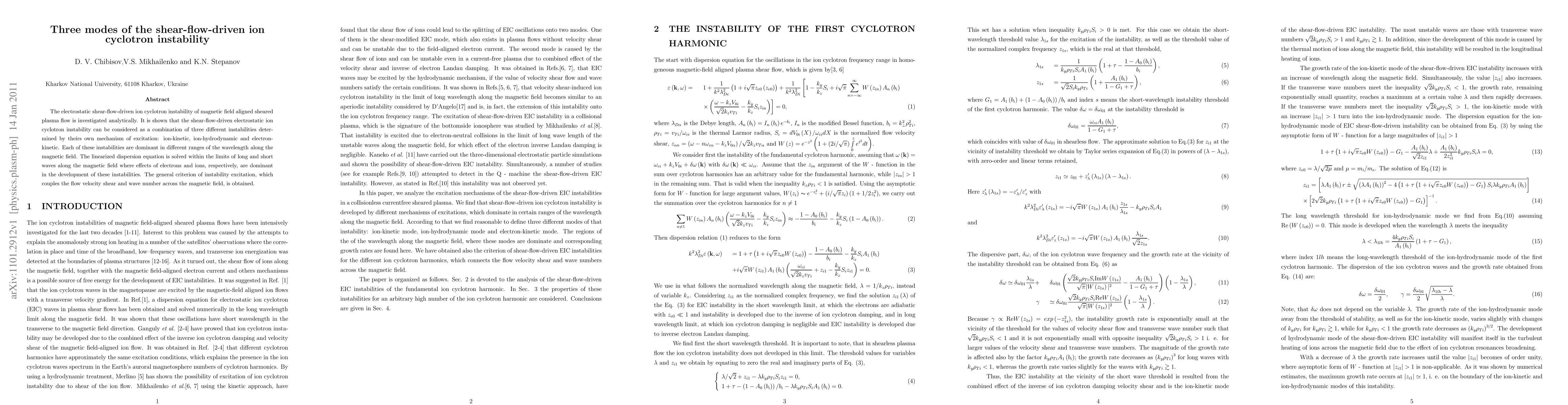 The electrostatic shear-flow-driven ion cyclotron instability of magnetic field aligned sheared plasma flow is investigated analytically. It is shown that the shear-flow-driven electrostatic ion cyclotron instability can be considered as a combination of three different instabilities determined by theirs own mechanism of excitation: ion-kinetic, ion-hydrodynamic and electron-kinetic. Each of these instabilities are dominant in different ranges of the wavelength along the magnetic field. The linearized dispersion equation is solved within the limits of long and short waves along the magnetic field where effects of electrons and ions, respectively, are dominant in the development of these instabilities. The general criterion of instability excitation, which couples the flow velocity shear and wave number across the magnetic field, is obtained.