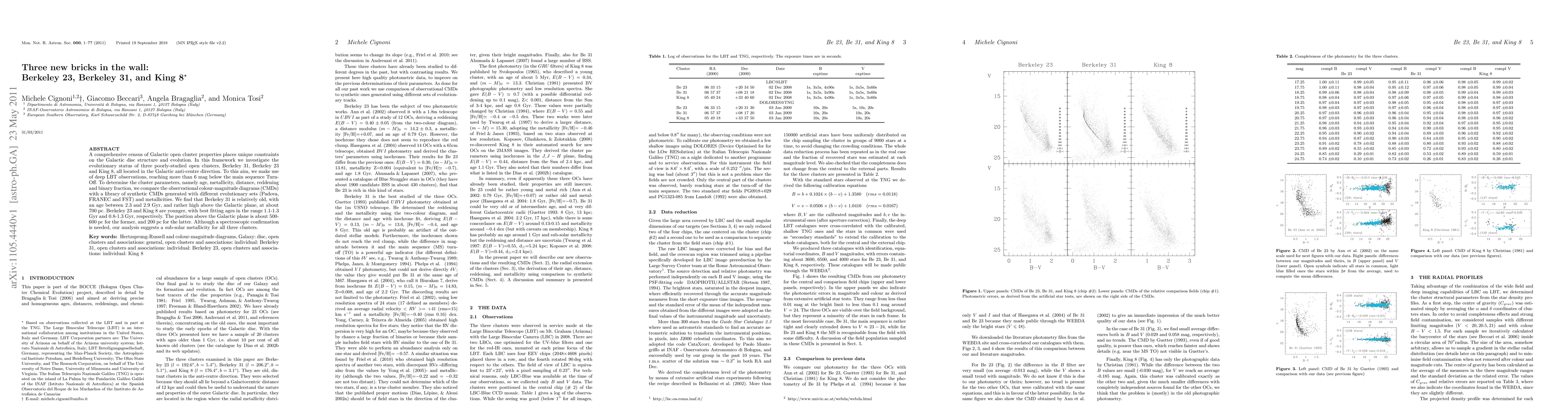 A comprehensive census of Galactic open cluster properties places unique constraints on the Galactic disc structure and evolution. In this framework we investigate the evolutionary status of three poorly-studied open clusters, Berkeley 31, Berkeley 23 and King 8, all located in the Galactic anti-centre direction. To this aim, we make use of deep LBT observations, reaching more than 6 mag below the main sequence Turn- Off. To determine the cluster parameters, namely age, metallicity, distance, reddening and binary fraction, we compare the observational colour-magnitude diagrams (CMDs) with a library of synthetic CMDs generated with different evolutionary sets (Padova, FRANEC and FST) and metallicities. We find that Berkeley 31 is relatively old, with an age between 2.3 and 2.9 Gyr, and rather high above the Galactic plane, at about 700 pc. Berkeley 23 and King 8 are younger, with best fitting ages in the range 1.1-1.3 Gyr and 0.8-1.3 Gyr, respectively. The position above the Galactic plane is about 500- 600 pc for the former, and 200 pc for the latter. Although a spectroscopic confirmation is needed, our analysis suggests a sub-solar metallicity for all three clusters.