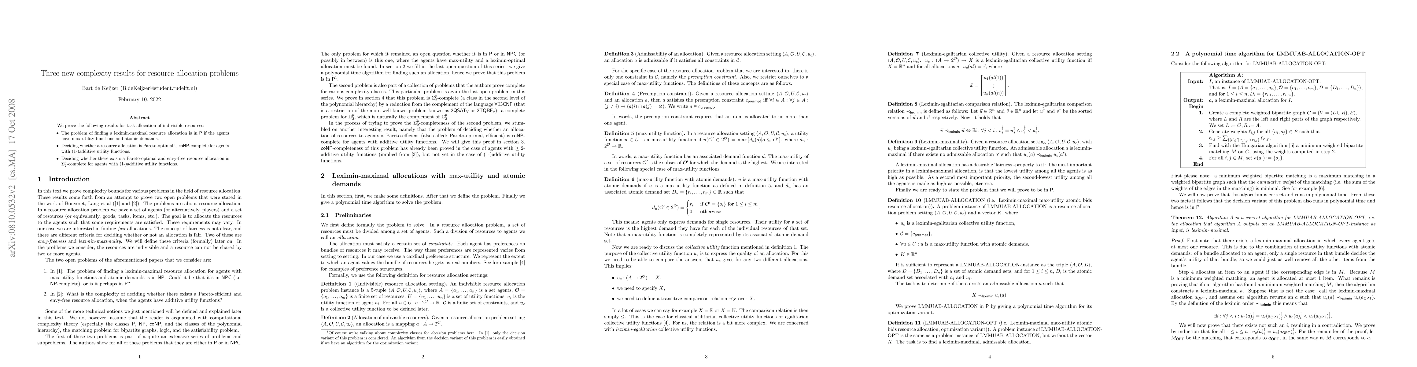 This paper establishes key complexity results for resource allocation problems, including a P problem for finding leximin-maximal allocations with max-utility functions and atomic demands, but shows coNP-completeness and Sigma_2^p-completeness for other conditions.