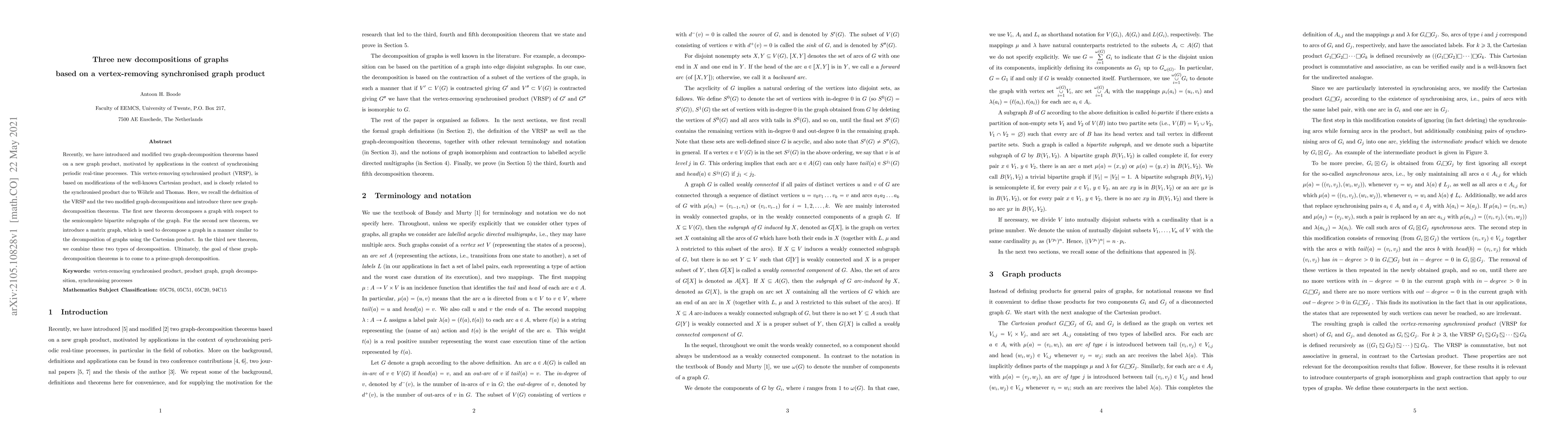 Recently, we have introduced and modified two graph-decomposition theorems based on a new graph product, motivated by applications in the context of synchronising periodic real-time processes. This vertex-removing synchronised product (VRSP), is based on modifications of the well-known Cartesian product, and is closely related to the synchronised product due to Wohrle and Thomas. Here, we recall the definition of the VRSP and the two modified graph-decompositions and introduce three new graph-decomposition theorems. The first new theorem decomposes a graph with respect to the semicomplete bipartite subgraphs of the graph. For the second new theorem, we introduce a matrix graph, which is used to decompose a graph in a manner similar to the decomposition of graphs using the Cartesian product. In the third new theorem, we combine these two types of decomposition. Ultimately, the goal of these graph-decomposition theorems is to come to a prime-graph decomposition.