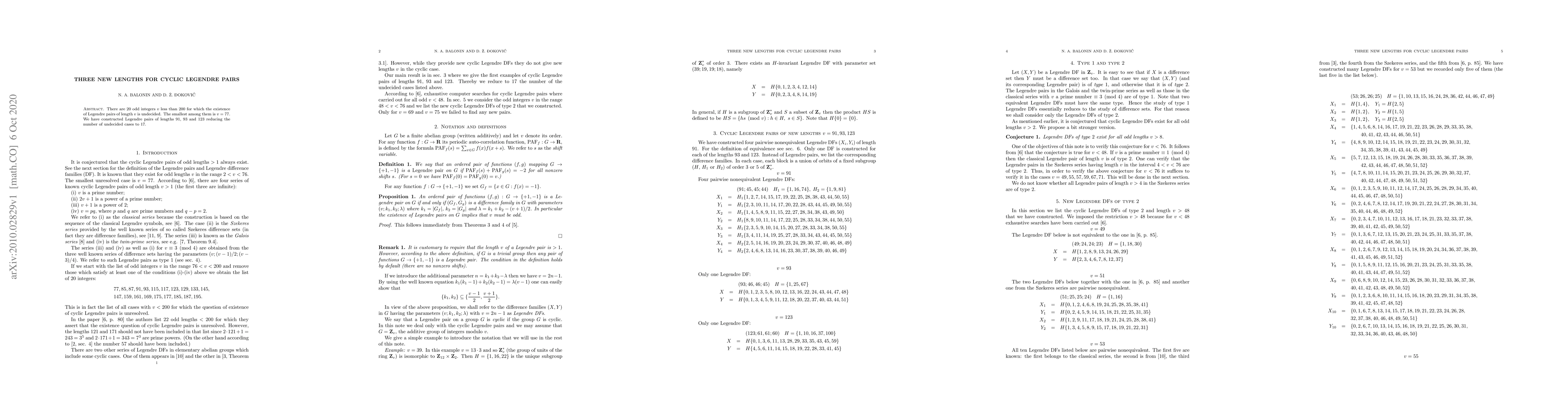 This paper reports the construction of three new Legendre pairs of lengths 91, 93, and 123, reducing the number of undecided cases for odd integers v under 200 to 17, with the smallest undecided case now being v=77.