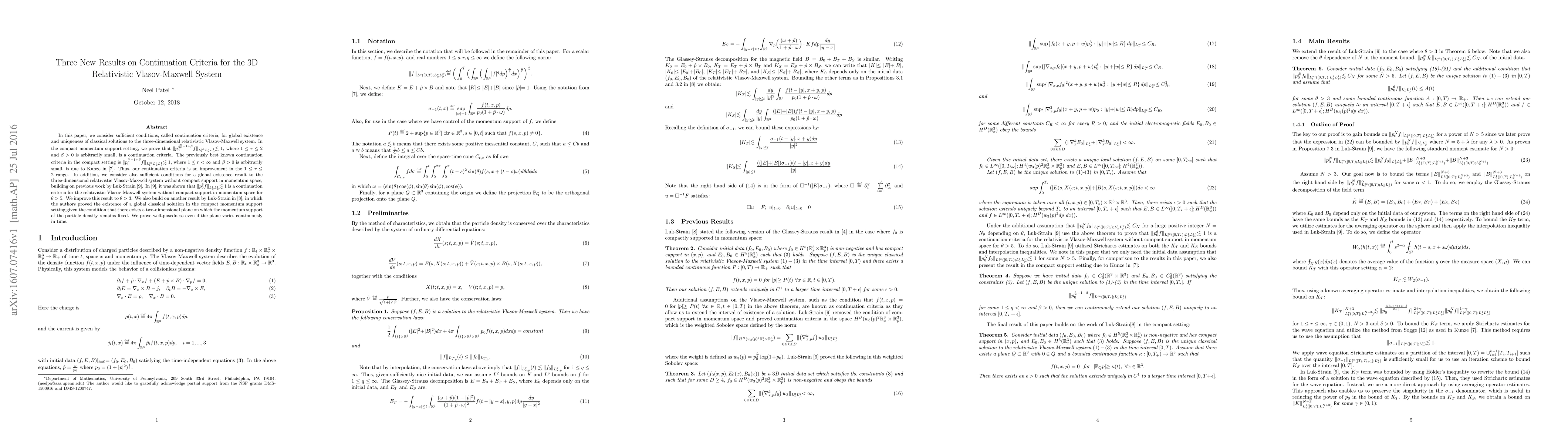 In this paper, we consider sufficient conditions, called continuation criteria, for global existence and uniqueness of classical solutions to the three-dimensional relativistic Vlasov-Maxwell system. In the compact momentum support setting, we prove that $\|p_{0}^{\frac{18}{5r} - 1+\beta}f\|_{L^{\infty}_{t}L^{r}_{x}L^{1}_{p}} \lesssim 1$, where $1\leq r \leq 2$ and $\beta >0$ is arbitrarily small, is a continuation criteria. The previously best known continuation criteria in the compact setting is $\|p_{0}^{\frac{4}{r} - 1+\beta}f\|_{L^{\infty}_{t}L^{r}_{x}L^{1}_{p}} \lesssim 1$, where $1\leq r < \infty$ and $\beta >0$ is arbitrarily small, is due to work by Kunze. Thus, our continuation criteria is an improvement in the $1\leq r \leq 2$ range. In addition, we consider also sufficient conditions for a global existence result to the three-dimensional relativistic Vlasov-Maxwell system without compact support in momentum space, building on previous work by Luk-Strain. In their work, it was shown that $\|p_{0}^{\theta}f\|_{L^{1}_{x}L^{1}_{p}} \lesssim 1$ is a continuation criteria for the relativistic Vlasov-Maxwell system without compact support in momentum space for $\theta > 5$. We improve this result to $\theta > 3$. We also build on another result by Luk-Strain, in which the authors proved the existence of a global classical solution in the compact momentum support setting given the condition that there exists a two-dimensional plane on which the momentum support of the particle density remains fixed. We prove well-posedness even if the plane varies continuously in time.