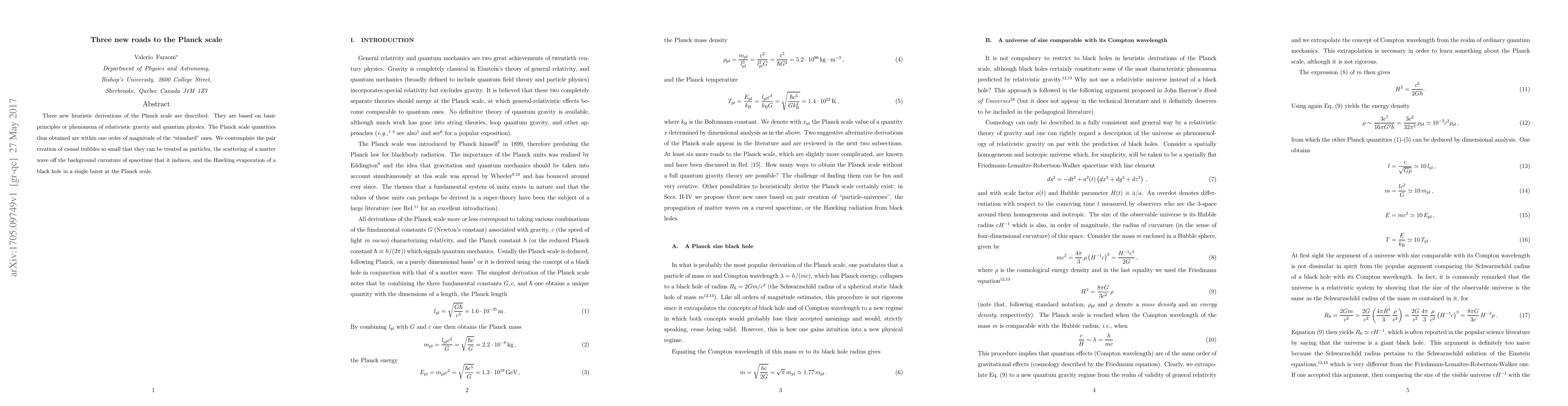 Three new heuristic derivations of the Planck scale are described. They are based on basic principles or phenomena of relativistic gravity and quantum physics. The Planck scale quantities thus obtained are within one order of magnitude of the "standard" ones. We contemplate the pair creation of causal bubbles so small that they can be treated as particles, the scattering of a matter wave off the background curvature of spacetime that it induces, and the Hawking evaporation of a black hole in a single burst at the Planck scale.