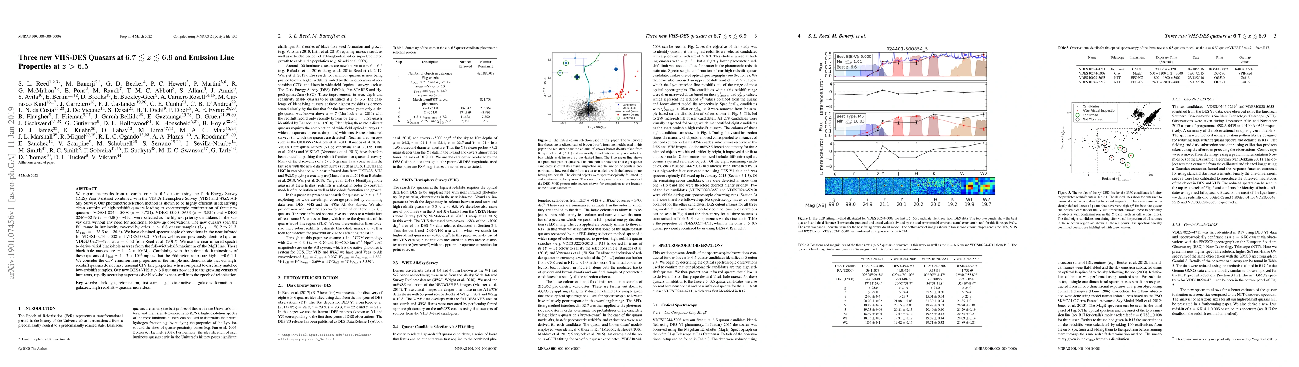 We report the results from a search for z > 6.5 quasars using the Dark Energy Survey (DES) Year 3 dataset combined with the VISTA Hemisphere Survey (VHS) and WISE All-Sky Survey. Our photometric selection method is shown to be highly efficient in identifying clean samples of high-redshift quasars leading to spectroscopic confirmation of three new quasars - VDESJ 0244-5008 (z=6.724), VDESJ 0020-3653 (z=6.834) and VDESJ 0246-5219 (z=6.90) - which were selected as the highest priority candidates in the survey data without any need for additional follow-up observations. The new quasars span the full range in luminosity covered by other z>6.5 quasar samples (J AB = 20.2 to 21.3; M1450 = -25.6 to -26.6). We have obtained spectroscopic observations in the near infrared for VDESJ 0244-5008 and VDESJ 0020-3653 as well as our previously identified quasar, VDESJ 0224-4711 at z=6.50 from Reed et al. (2017). We use the near infrared spectra to derive virial black-hole masses from the full-width-half-maximum of the MgII line. These black-hole masses are ~ 1 - 2 x 10$^9$M$_\odot$. Combining with the bolometric luminosities of these quasars of L$_{\rm{bol}}\simeq$ 1 - 3 x 10$^{47}$implies that the Eddington ratios are high - $\simeq$0.6-1.1. We consider the C\textrm{\textsc{IV}} emission line properties of the sample and demonstrate that our high-redshift quasars do not have unusual C\textrm{\textsc{IV}} line properties when compared to carefully matched low-redshift samples. Our new DES+VHS $z>6.5$ quasars now add to the growing census of luminous, rapidly accreting supermassive black-holes seen well into the epoch of reionisation.