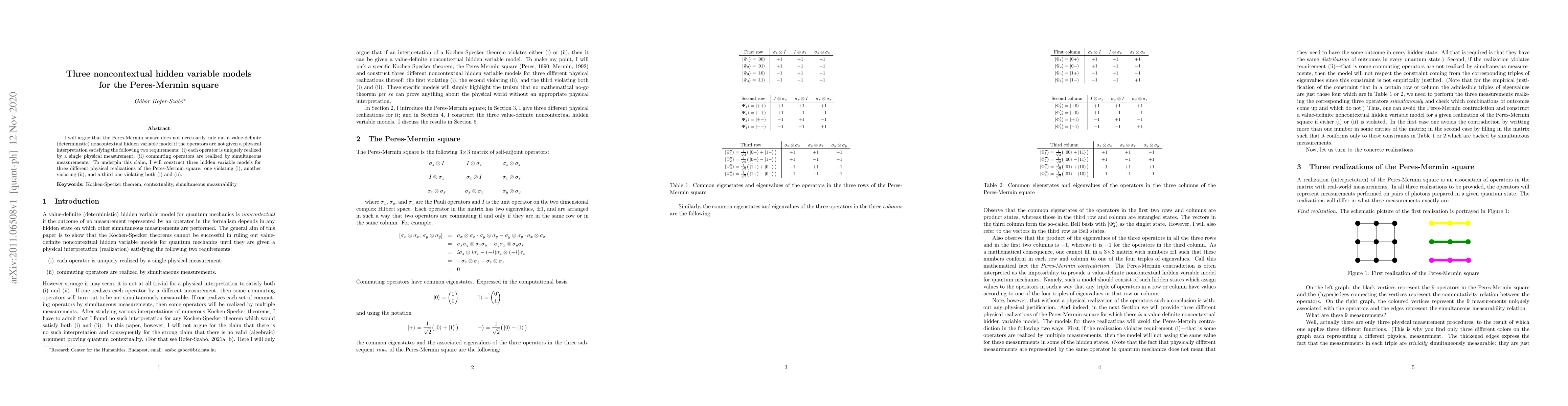 I will argue that the Peres-Mermin square does not necessarily rule out a value-definite (deterministic) noncontextual hidden variable model if the operators are not given a physical interpretation satisfying the following two requirements: (i) each operator is uniquely realized by a single physical measurement; (ii) commuting operators are realized by simultaneous measurements. To underpin this claim, I will construct three hidden variable models for three different physical realizations of the Peres-Mermin square: one violating (i), another violating (ii), and a third one violating both (i) and (ii).