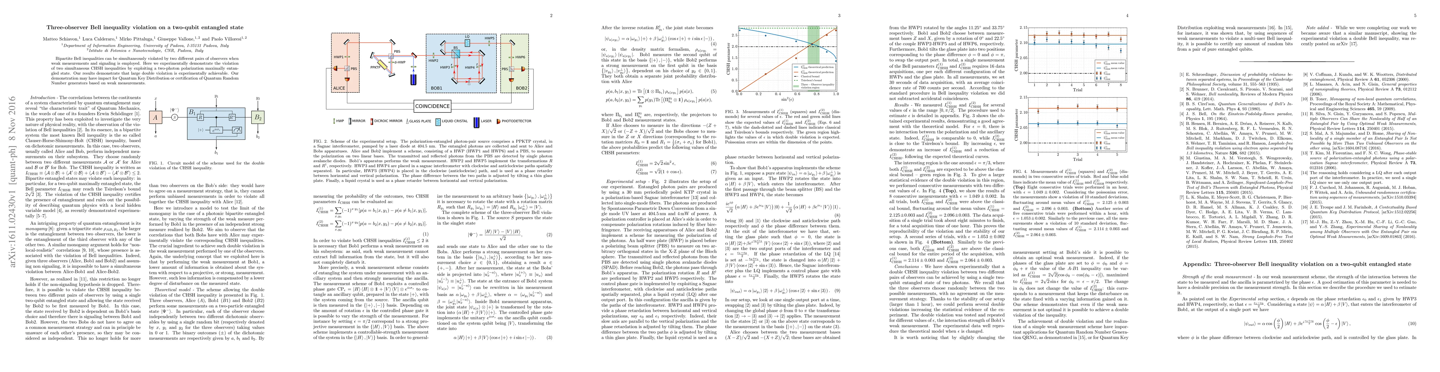 Bipartite Bell inequalities can be simultaneously violated by two different pairs of observers when weak measurements and signaling is employed. Here we experimentally demonstrate the violation of two simultaneous CHSH inequalities by exploiting a two-photon polarization maximally entangled state. Our results demonstrate that large double violation is experimentally achievable. Our demonstration may have impact for Quantum Key Distribution or certification of Quantum Random Number generators based on weak measurements.