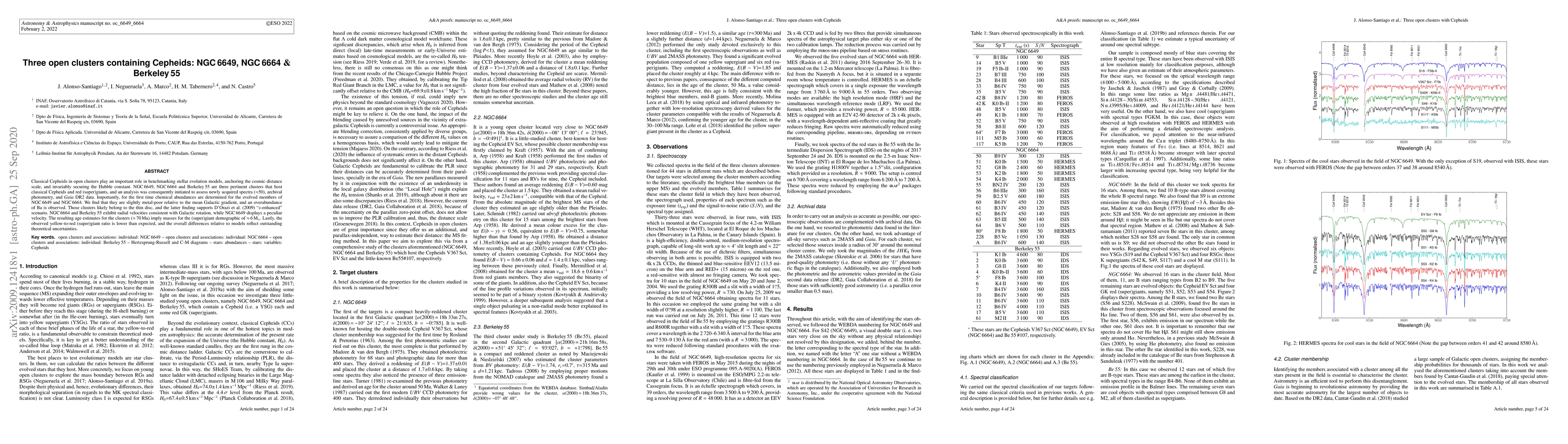 Classical Cepheids in open clusters play an important role in benchmarking stellar evolution models, anchoring the cosmic distance scale, and invariably securing the Hubble constant. NGC 6649, NGC 6664 and Berkeley 55 are three pertinent clusters that host classical Cepheids and red (super)giants, and an analysis was consequently initiated to assess newly acquired spectra ($\approx$50), archival photometry, and $Gaia$ DR2 data. Importantly, for the first time chemical abundances are determined for the evolved members of NGC 6649 and NGC 6664. We find that they are slightly metal-poor relative to the mean Galactic gradient, and an overabundance of Ba is observed. Those clusters likely belong to the thin disc, and the latter finding supports D'Orazi et al. (2009) "$s$-enhanced" scenario. NGC 6664 and Berkeley 55 exhibit radial velocities consistent with Galactic rotation, while NGC 6649 displays a peculiar velocity. The resulting age estimates for the clusters ($\approx$70 Ma) imply masses for the (super)giant demographic of $\approx$6 M$_{sun}$. Lastly, the observed yellow-to-red (super)giant ratio is lower than expected, and the overall differences relative to models reflect outstanding theoretical uncertainties.