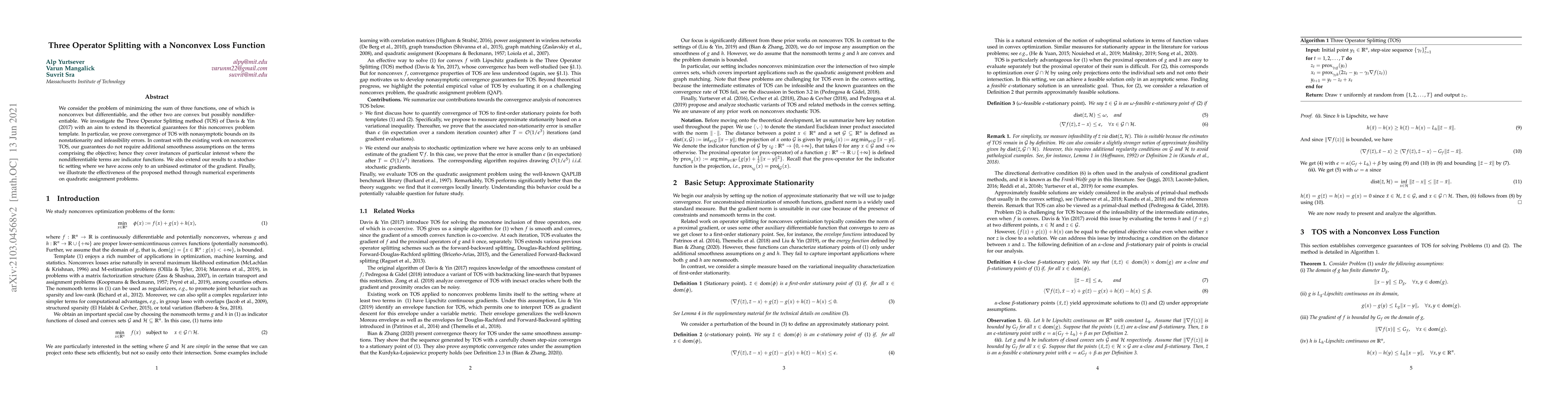 This paper extends the Three Operator Splitting method (TOS) to minimize the sum of three functions, with one nonconvex and differentiable, and two convex but possibly nondifferentiable. It provides nonasymptotic convergence guarantees without additional smoothness assumptions, and demonstrates effectiveness through numerical experiments on quadratic assignment problems.