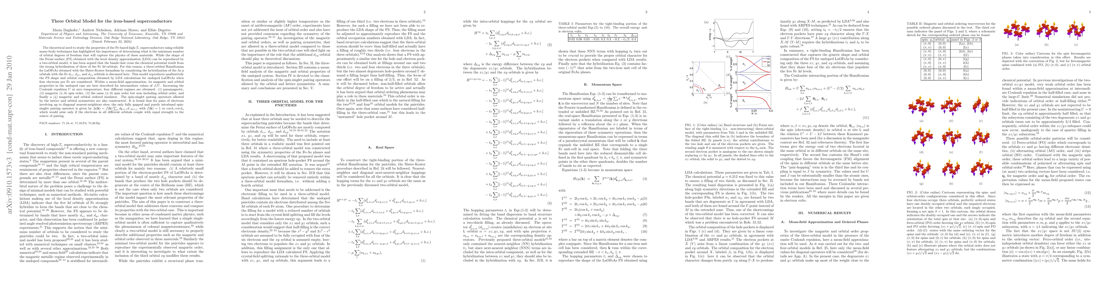 The theoretical need to study the properties of the Fe-based high-T_c superconductors with reliable many-body techniques requires us to determine the minimum number of orbital degrees of freedom that will capture the physics of these materials. While the shape of the Fermi surface (FS) obtained with the local density approximation (LDA) can be reproduced by a two-orbital model, it has been argued that the bands that cross the chemical potential result from the strong hybridization of three of the Fe 3d orbitals. For this reason, a three-orbital Hamiltonian obtained with the Slater-Koster formalism by considering the hybridization of the As p orbitals with the Fe d_xz,d_yz, and d_xy orbitals is discussed here. This model reproduces qualitatively the FS shape and orbital composition obtained by LDA calculations for undoped pnictides when four electrons per Fe are considered. Within a mean-field approximation, its magnetic and orbital properties in the undoped case are described. With increasing Coulomb repulsion, four regimes are obtained: (1) paramagnetic, (2) magnetic (pi,0) spin order, (3) the same (pi,0) spin order but now including orbital order, and finally (4) a magnetic and orbital ordered insulator. The spin-singlet pairing operators allowed by the lattice and orbital symmetries are also constructed. It is found that for pairs of electrons involving up to diagonal nearest-neighbors sites, the only fully gapped and purely intraband spin-singlet pairing operator is given by Delta(k)=f(k)\sum_{alpha} d_{k,alpha,up}d_{-k,alpha,down} with f(k)=1 or f(k)=cos(k_x)cos(k_y) which would arise only if the electrons in all different orbitals couple with equal strength to the source of pairing.