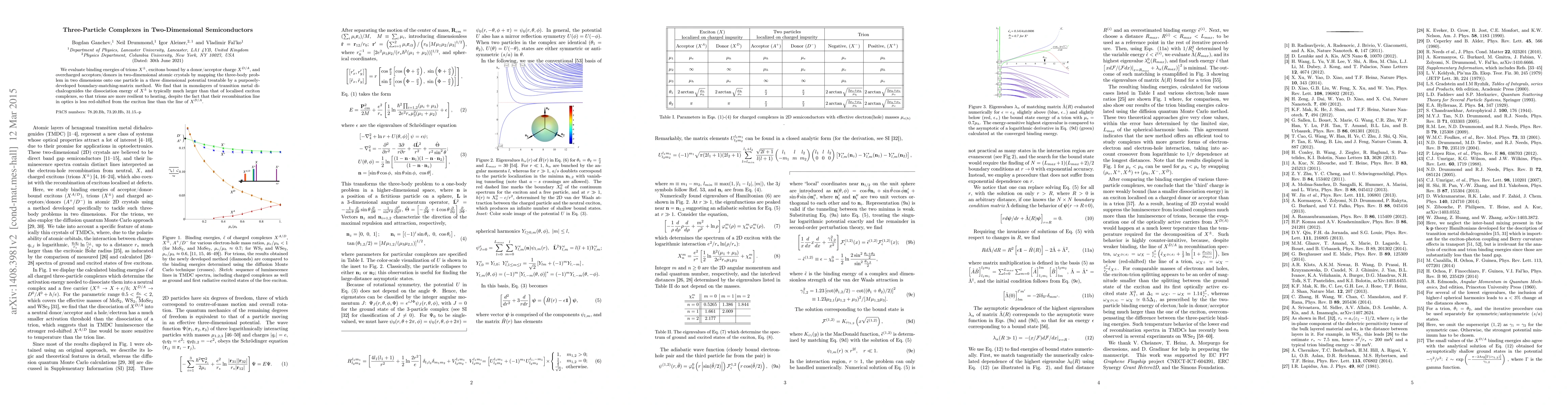 This paper develops a boundary-matching-matrix method to study three-particle complexes in two-dimensional semiconductors, finding that trions have higher dissociation energy than localized exciton complexes, making them more resilient to heating despite less red-shifted optical recombination lines.