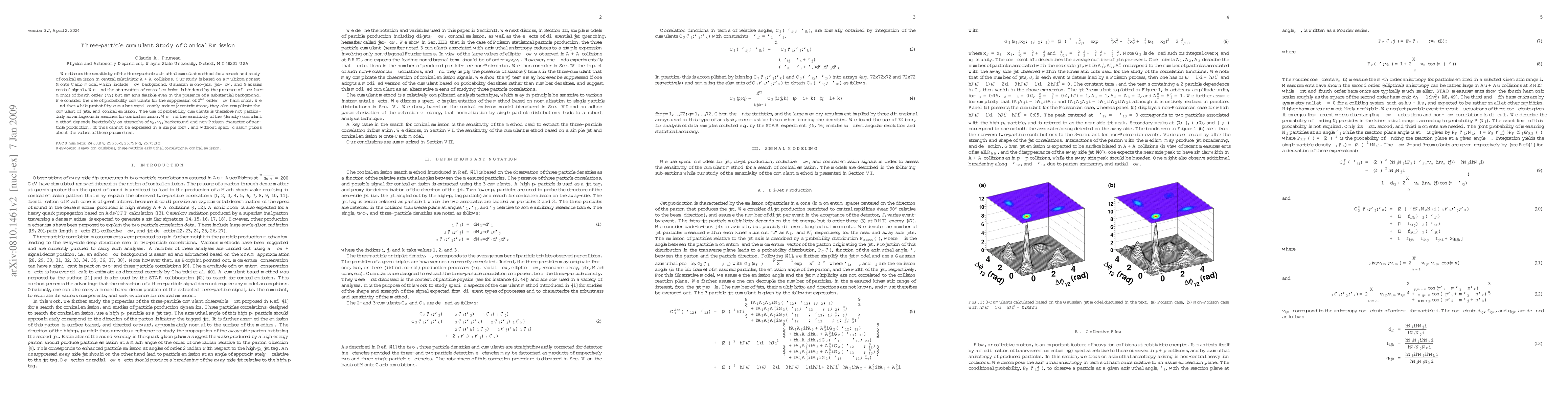 We discuss the sensitivity of the three-particle azimuthal cumulant method for a search and study of conical emission in central relativistic $A+A $ collisions. Our study is based on a multi-component Monte Carlo model which include flow background, Gaussian mono-jets, jet-flow, and Gaussian conical signals. We find the observation of conical emission is hindered by the presence of flow harmonics of fourth order ($v_4 $) but remains feasible even in the presence of a substantial background. We consider the use of probability cumulants for the suppression of 2$^{nd}$ order flow harmonics. We find that while probability cumulant significantly reduce $v_2^2$ contributions, they also complicate the cumulant of jets, and conical emission. The use of probability cumulants is therefore not particularly advantageous in searches for conical emission. We find the sensitivity of the (density) cumulant method depends inextricably on strengths of $v_2 $, $v_4 $, background and non-Poisson character of particle production. It thus cannot be expressed in a simple form, and without specific assumptions about the values of these parameters.