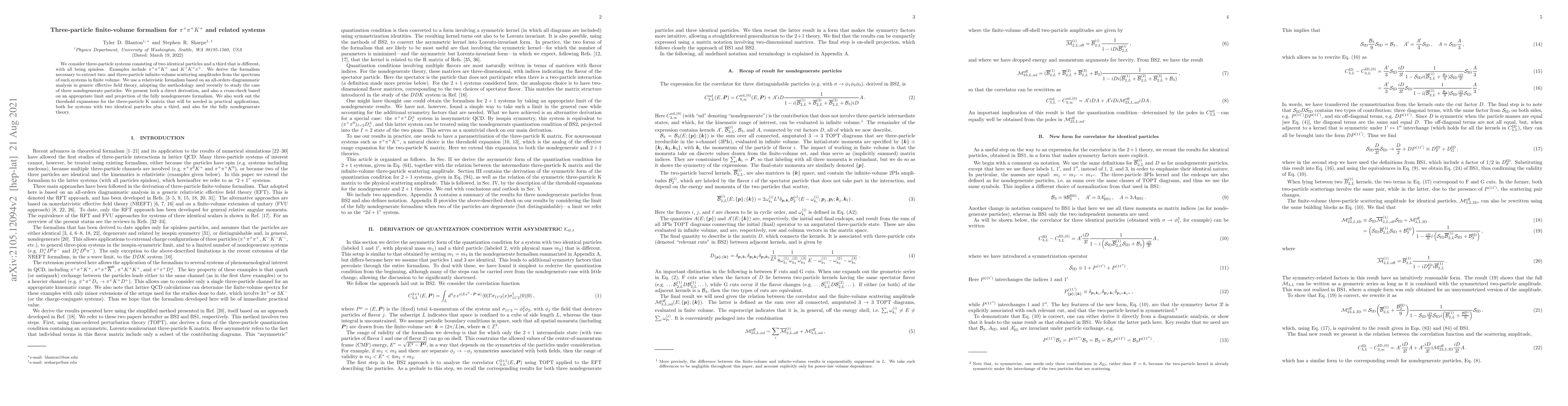 Researchers developed a method to analyze three-particle systems in finite volume using relativistic formalism, enabling extraction of scattering amplitudes for particles like $ au^+ au^+K^+$ and $K^+K^+ au^+$.