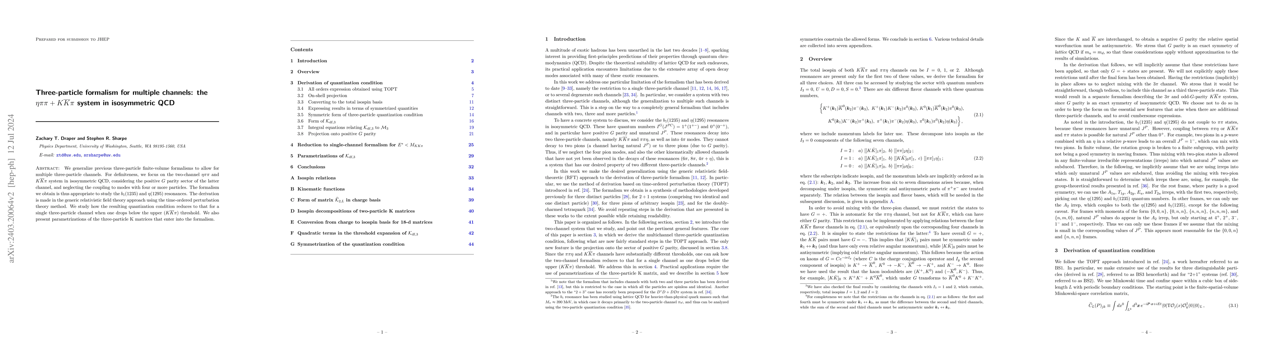 This paper generalizes three-particle finite-volume formalisms for multiple channels, focusing on the $\eta \pi \pi$ and $K \overline K \pi$ systems in isosymmetric QCD. It uses relativistic field theory and time-ordered perturbation theory to study resonances like $b_1(1235)$ and $\eta(1295)$, and provides parametrizations for the three-particle K matrices.