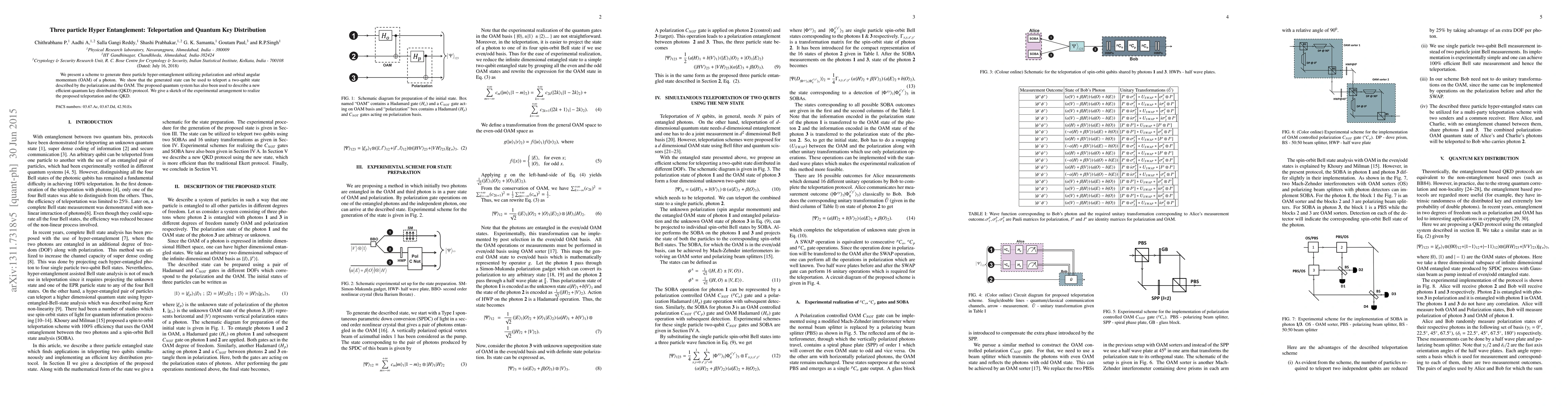 This paper proposes a scheme to generate three-particle hyper-entanglement using photon polarization and orbital angular momentum. The generated entangled state enables teleportation of a two-qubit state and serves as the basis for a new efficient quantum key distribution protocol, with a sketch of experimental setup provided.