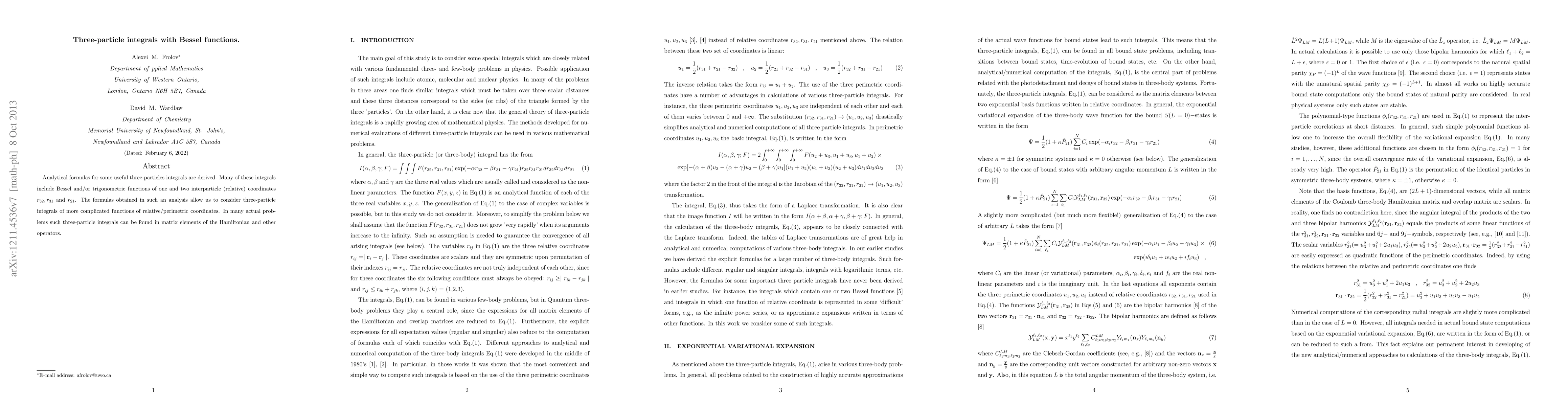This paper derives analytical formulas for three-particle integrals involving Bessel and trigonometric functions of relative coordinates. These results enable the evaluation of more complex integrals in physical problems, especially in matrix elements of Hamiltonians and related operators.