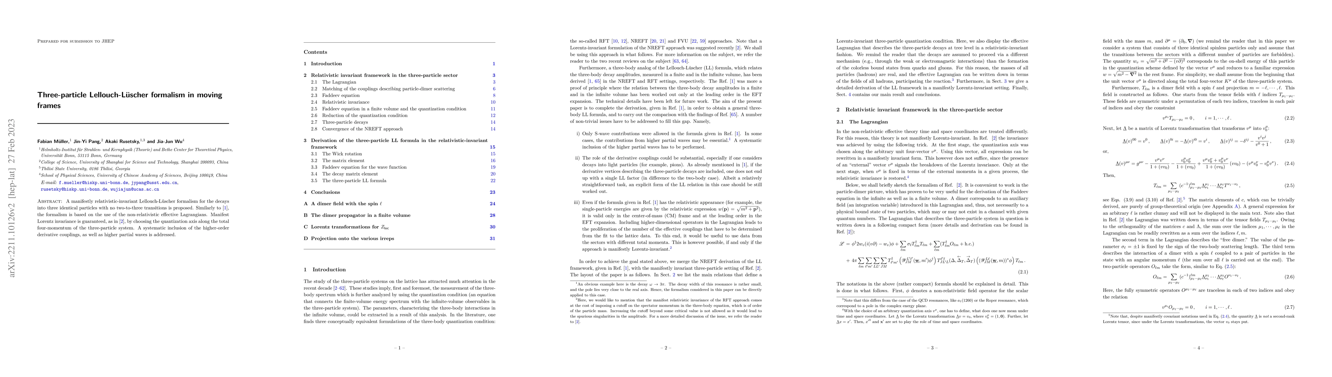 A manifestly relativistic-invariant Lellouch-L\"uscher formalism for the three-particle decays is proposed. Similarly to ref.[1], the formalism is based on the use of the non-relativistic effective Lagrangians. Manifest Lorentz invariance is guaranteed, as in ref.[2], by choosing the quantization axis along the total four-momentum of the three-particle system. A systematic inclusion of the higher-order derivative couplings, as well as higher partial waves is addressed.