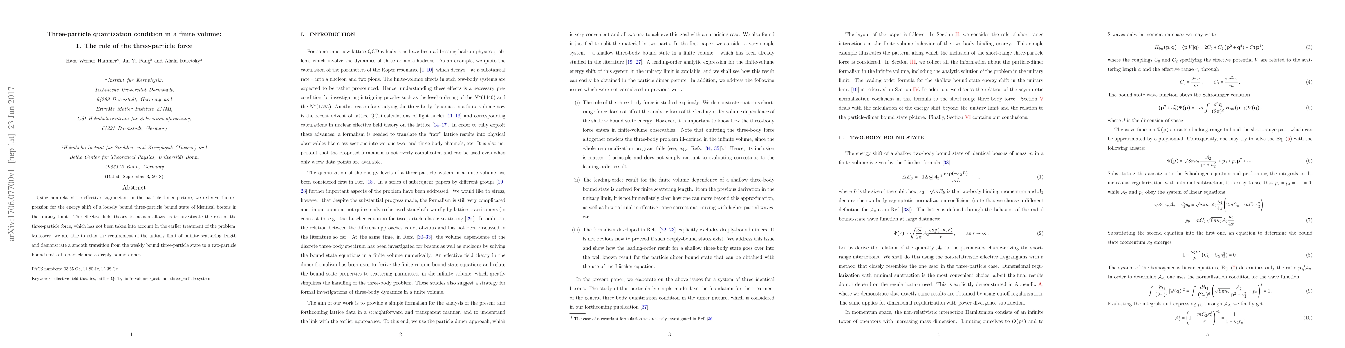 Using non-relativistic effective Lagrangians in the particle-dimer picture, we rederive the expression for the energy shift of a loosely bound three-particle bound state of identical bosons in the unitary limit. The effective field theory formalism allows us to investigate the role of the three-particle force, which has not been taken into account in the earlier treatment of the problem. Moreover, we are able to relax the requirement of the unitary limit of infinite scattering length and demonstrate a smooth transition from the weakly bound three-particle state to a two-particle bound state of a particle and a deeply bound dimer.