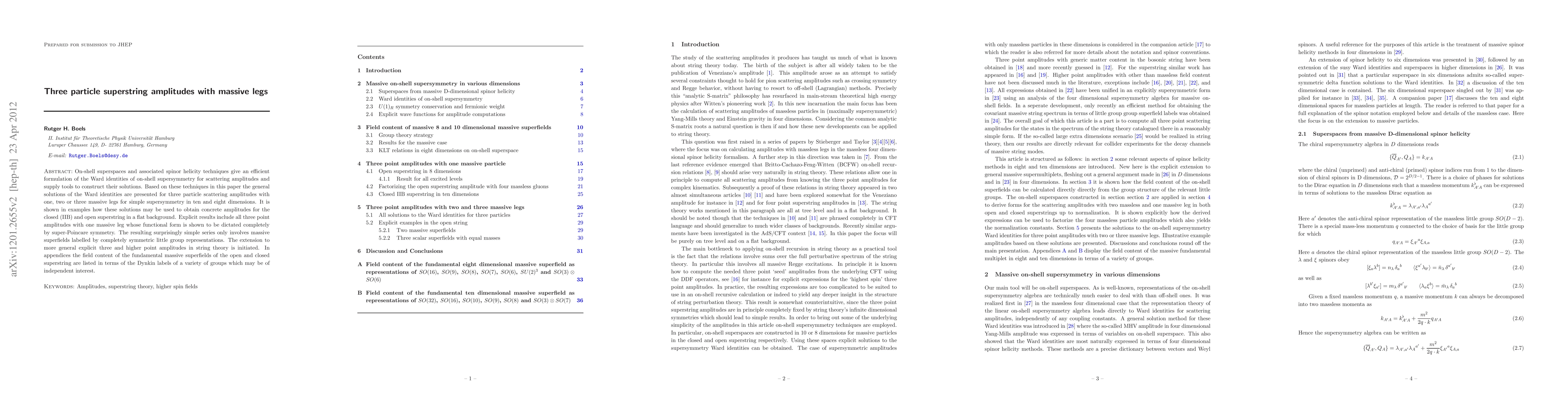 On-shell superspaces and associated spinor helicity techniques give an efficient formulation of the Ward identities of on-shell supersymmetry for scattering amplitudes and supply tools to construct their solutions. Based on these techniques in this paper the general solutions of the Ward identities are presented for three particle scattering amplitudes with one, two or three massive legs for simple supersymmetry in ten and eight dimensions. It is shown in examples how these solutions may be used to obtain concrete amplitudes for the closed (IIB) and open superstring in a flat background. Explicit results include all three point amplitudes with one massive leg whose functional form is shown to be dictated completely by super-Poincare symmetry. The resulting surprisingly simple series only involves massive superfields labelled by completely symmetric little group representations. The extension to more general explicit three and higher point amplitudes in string theory is initiated. In appendices the field content of the fundamental massive superfields of the open and closed superstring are listed in terms of the Dynkin labels of a variety of groups which may be of independent interest.