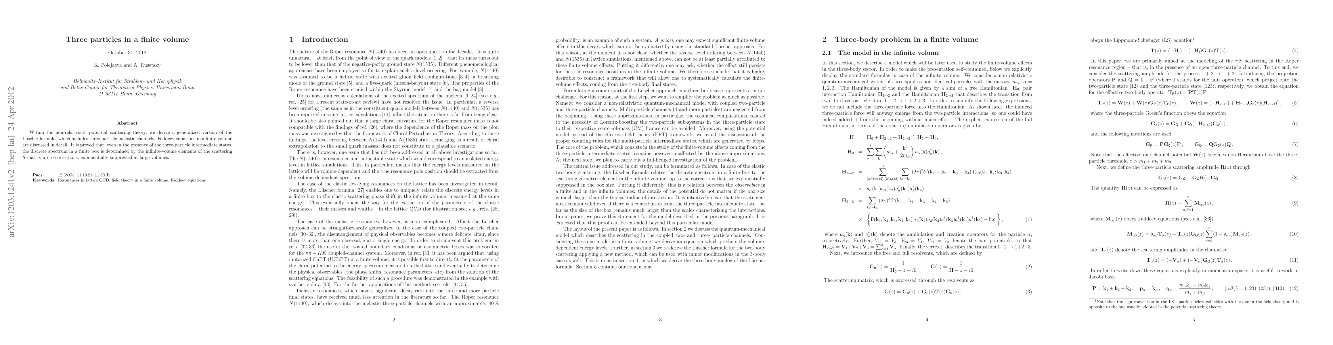 Within the non-relativistic potential scattering theory, we derive a generalized version of the L\"uscher formula, which includes three-particle inelastic channels. Faddeev equations in a finite volume are discussed in detail. It is proved that, even in the presence of the three-particle intermediate states, the discrete spectrum in a finite box is determined by the infinite-volume elements of the scattering S-matrix up to corrections, exponentially suppressed at large volumes.