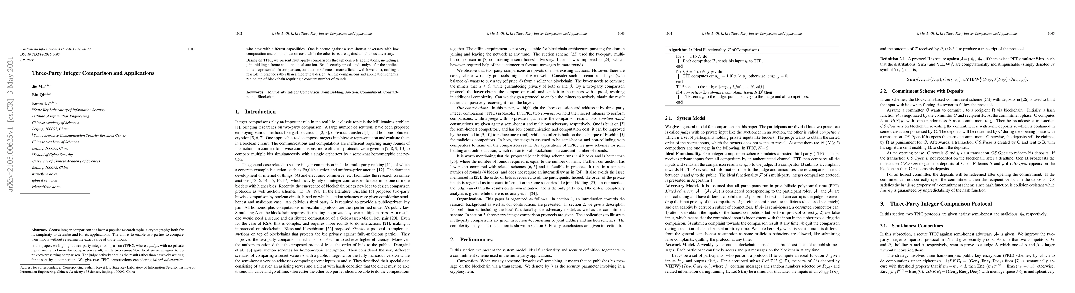 Secure integer comparison has been a popular research topic in cryptography, both for its simplicity to describe and for its applications. The aim is to enable two parties to compare their inputs without revealing the exact value of those inputs. In this paper, we highlight three-party integer comparison (TPIC), where a \emph{judge}, with no private input, wants to know the comparison result, while two \emph{competitors} hold secret integers to do privacy-preserving comparison. The judge actively obtains the result rather than passively waiting for it sent by a competitor. We give two TPIC constructions considering \emph{Mixed adversaries}, who have with different capabilities. One is secure against a semi-honest adversary with low computation and communication cost, while the other is secure against a malicious adversary. Basing on TPIC, we present multi-party comparisons through concrete applications, including a joint bidding scheme and a practical auction. Brief security proofs and analysis for the applications are presented. In comparison, our auction scheme is more efficient with lower cost, making it feasible in practice rather than a theoretical design. All the comparisons and application schemes run on top of blockchain requiring a constant number of rounds.