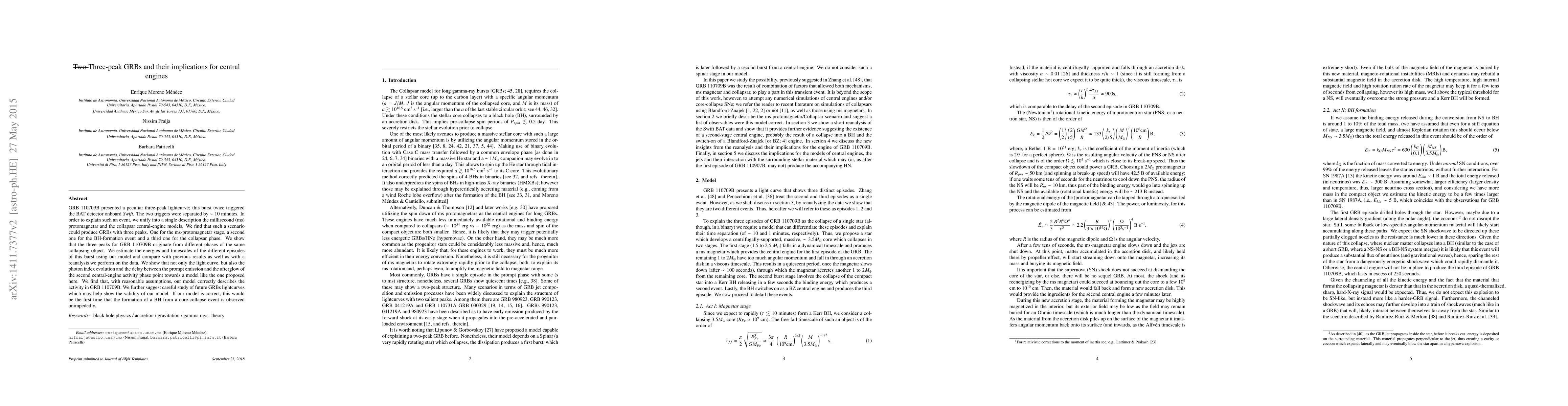 The paper proposes a unified model for the three-peaked gamma-ray burst (GRB) 110709B, merging the millisecond protomagnetar and collapsar central-engine models. It suggests the three peaks result from distinct phases of the same collapsing object: protomagnetar, black hole formation, and collapsar. The model accurately describes the burst's energy, timescales, photon index evolution, and the delay between prompt emission and afterglow. If validated, this would be the first direct observation of black hole formation from a core-collapse event.