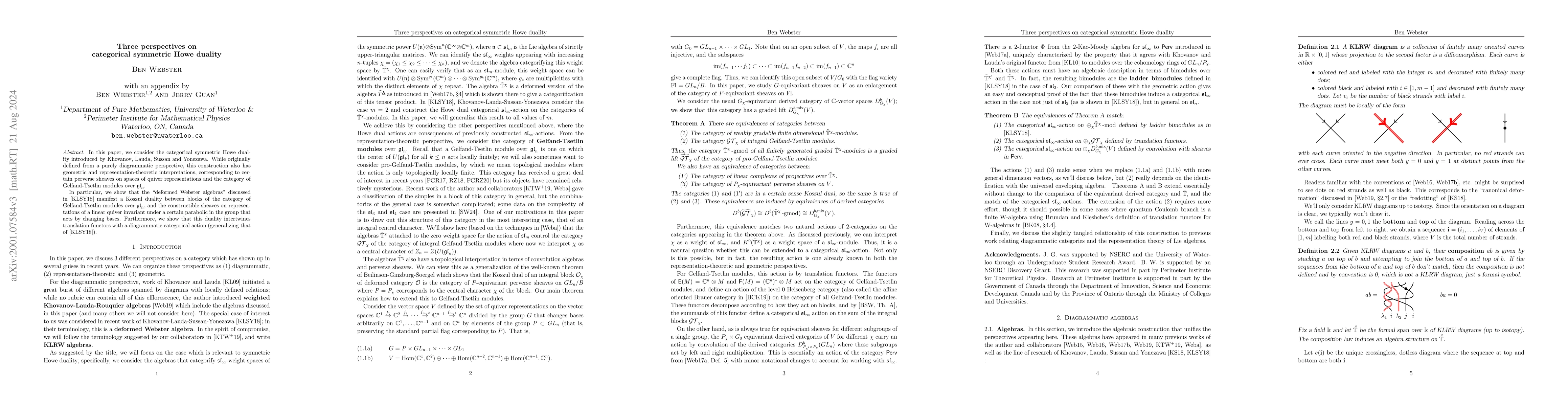 This paper explores categorical symmetric Howe duality from diagrammatic, geometric, and representation-theoretic viewpoints, showing a Koszul duality between Gelfand-Tsetlin modules and quiver representations, and linking translation functors with a diagrammatic categorical action. An appendix by the author and Jerry Guan provides additional insights.