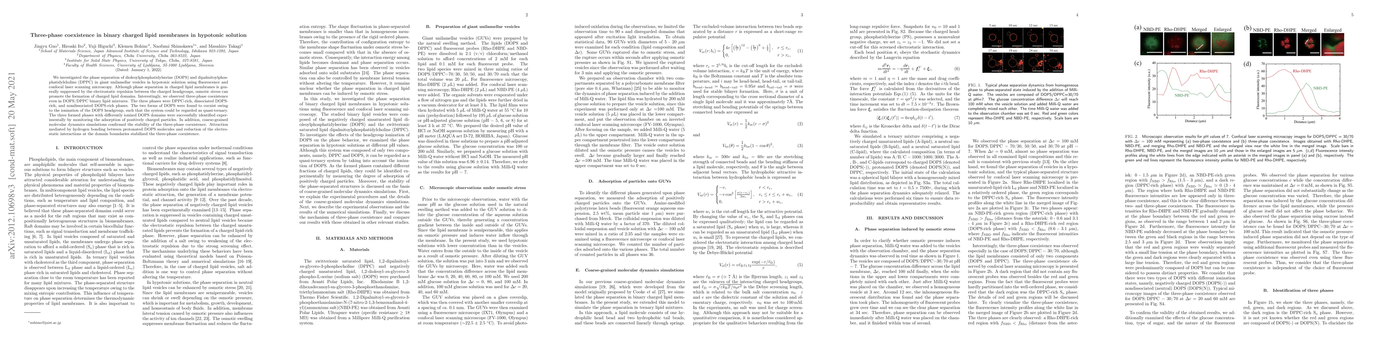 This study reveals the formation of three distinct phases in binary charged lipid membranes of dioleoylphosphatidylserine (DOPS) and dipalmitoylphosphatidylcholine (DPPC) under hypotonic conditions, identified as DPPC-rich, dissociated DOPS-rich, and nondissociated DOPS-rich phases, stabilized by hydrogen bonding and reduced electrostatic repulsion.