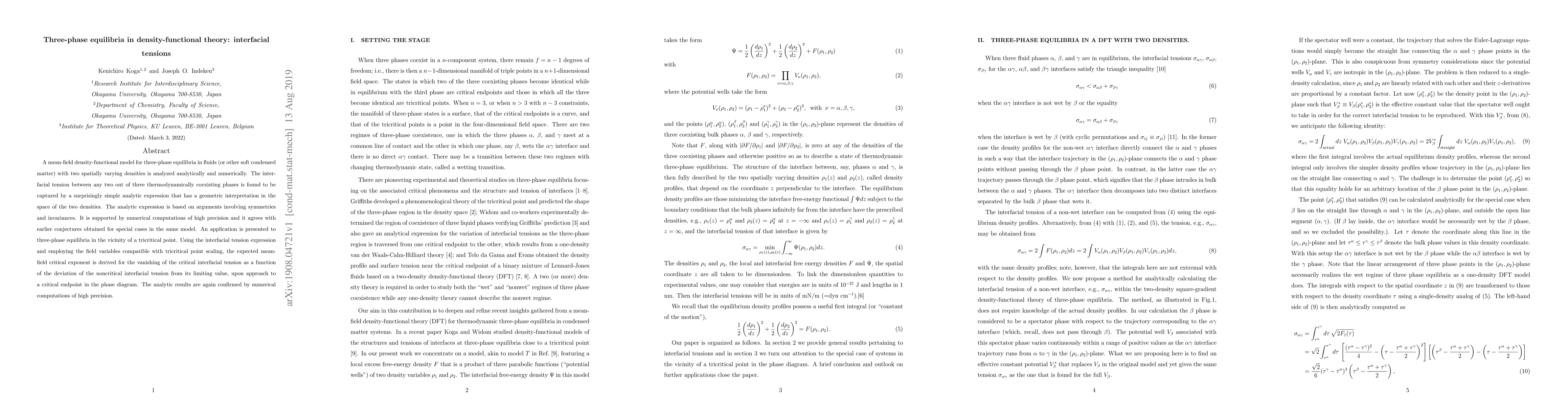 This paper develops a mean-field density-functional model for three-phase equilibria in fluids, deriving a simple analytic expression for interfacial tensions based on symmetries and invariances. The analytical results are confirmed by high-precision numerical computations and applied to tricritical points, deriving critical exponents for interfacial tension behavior near critical endpoints.